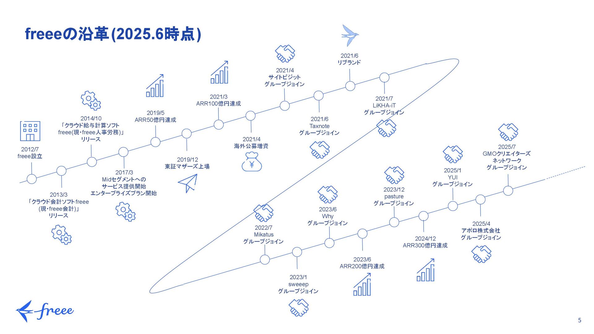 リリース 2017/3 Midセグメントへの サービス提供開始 エンタープライズプラン開始 2019/5 ARR50億円達成 2021/3 ARR100億円達成 2021/4 海外公募増資 2021/4 サイトビジット グループジョイン 2021/6 Taxnote グループジョイン 2021/6 リブランド 2022/7 Mikatus グループジョイン 2019/12 東証マザーズ上場 2023/1 sweeep グループジョイン 2023/6 Why グループジョイン 2023/6 ARR200億円達成 2023/12 pasture グループジョイン 2025/1 YUI グループジョイン 2024/12 ARR300億円達成 2025/4 アポロ株式会社 グループジョイン 2025/7 GMOクリエイターズ ネットワーク グループジョイン 2021/7 LiKHA-iT グループジョイン freeeの沿革(2025.6時点)