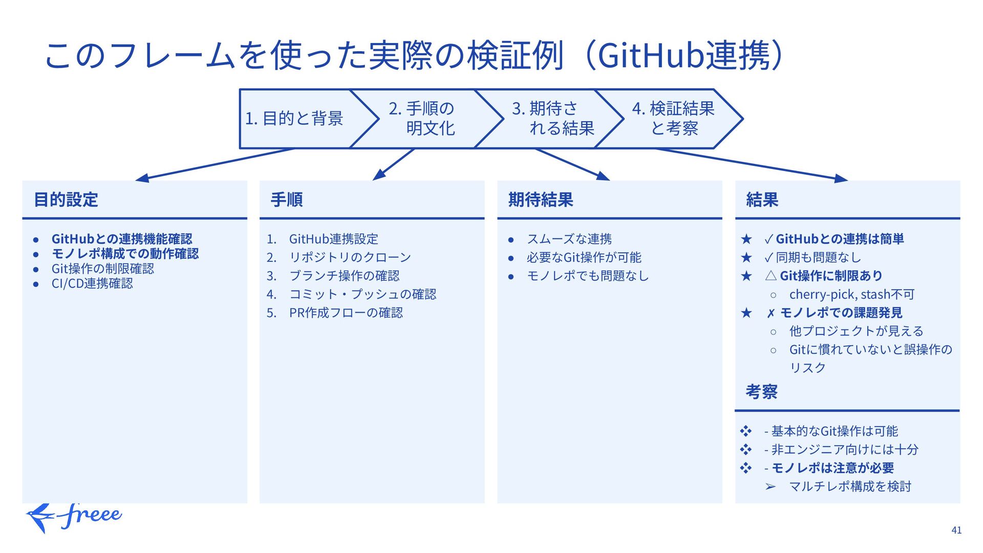 29. 41 このフレームを使った実際の検証例(GitHub連携) 1. ⽬的と背景 2. ⼿順の 明⽂化 3. 期待さ れる結果