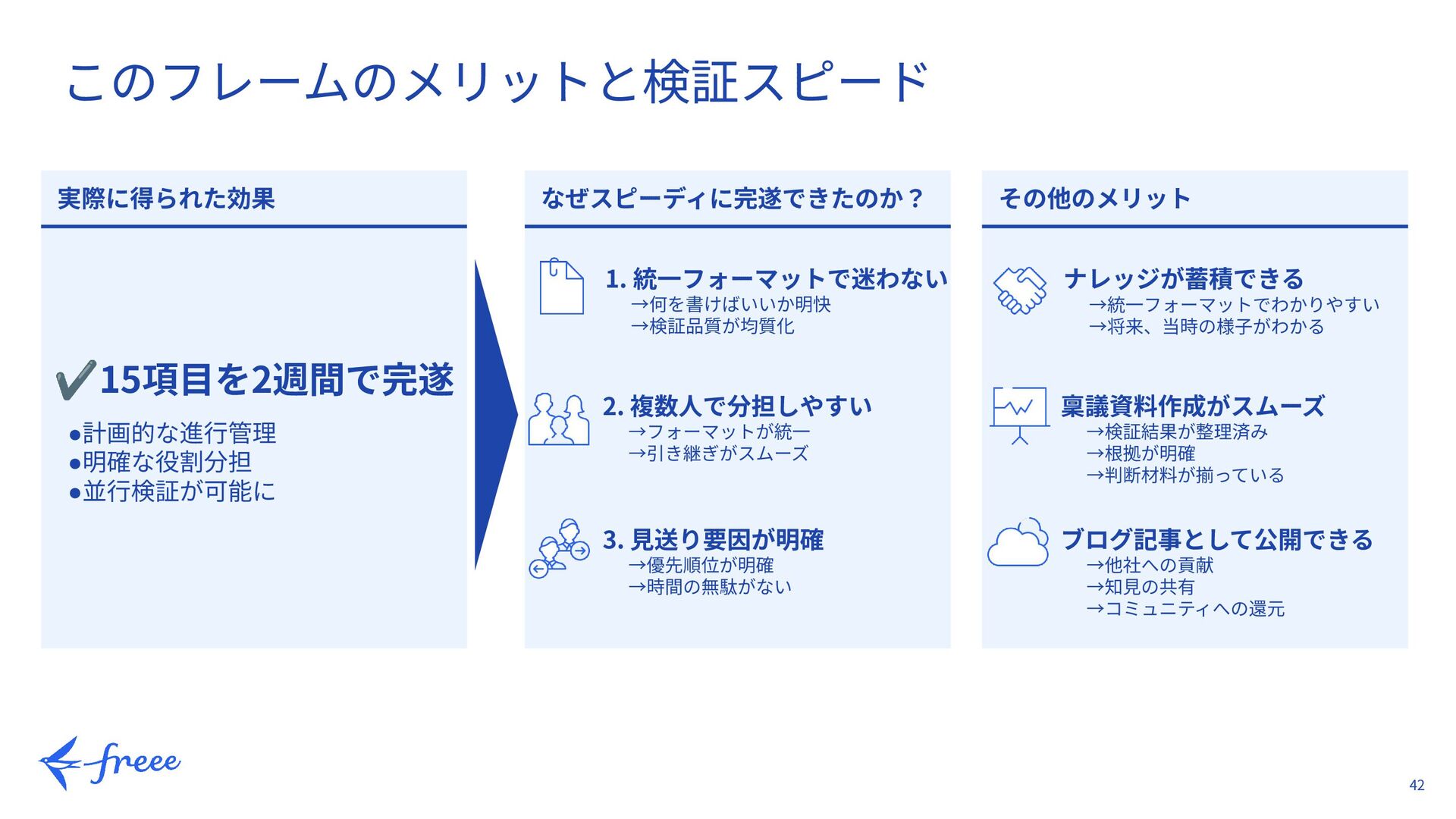 30. 42 このフレームのメリットと検証スピード 実際に得られた効果 ✔15項⽬を2週間で完遂 •計画的な進⾏管理 •明確な役割分担 •並⾏検証が可能に なぜスピーディに完遂できたのか? その他のメリット 1.