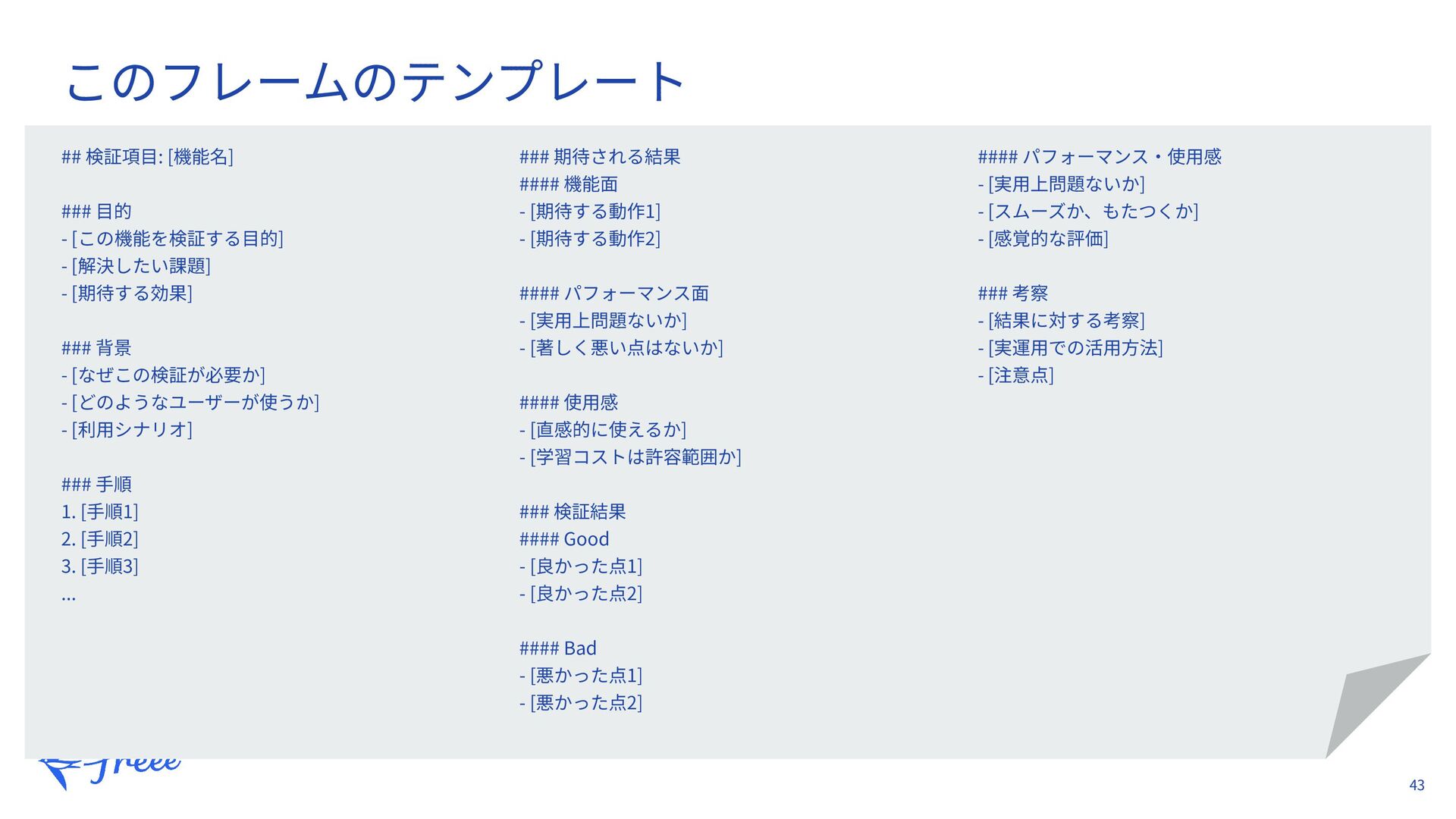 31. 43 ## 検証項⽬: [機能名] ### ⽬的 - [この機能を検証する⽬的] - [解決したい課題]