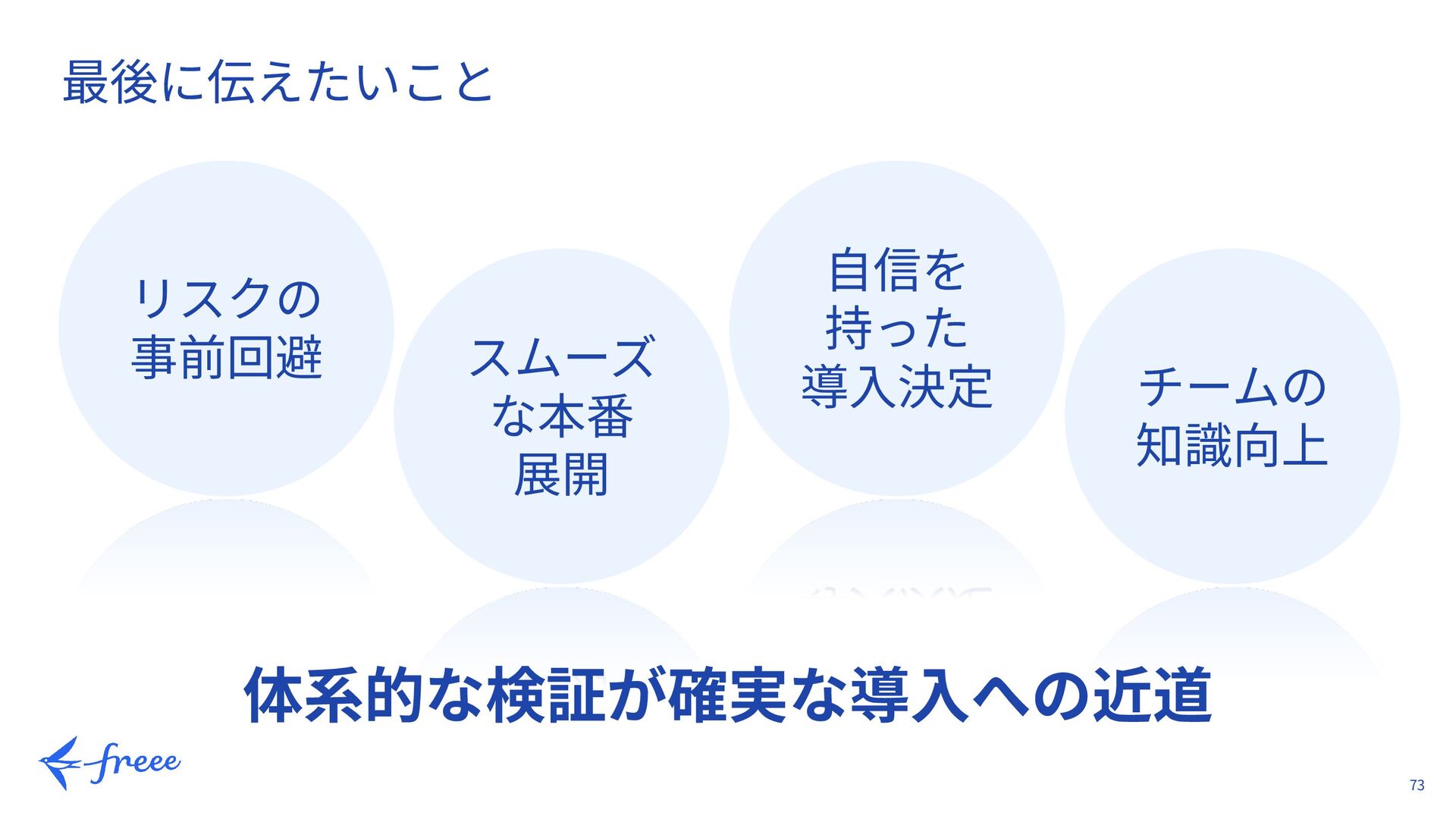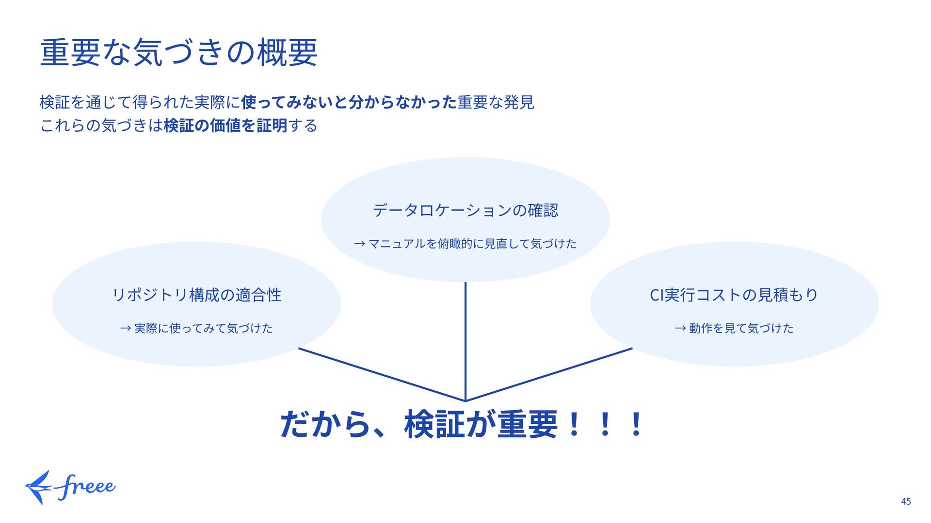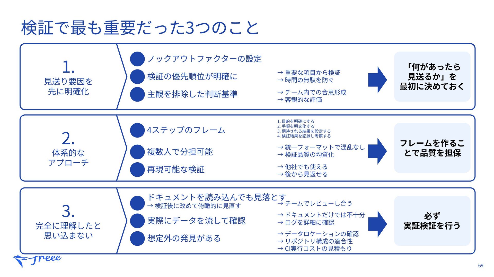 → 時間の無駄を防ぐ → チーム内での合意形成 → 客観的な評価 「何があったら ⾒送るか」を 最初に決めておく 2. 体系的な アプローチ 4ステップのフレーム 複数⼈で分担可能 再現可能な検証 1. ⽬的を明確にする 2. ⼿順を明⽂化する 3. 期待される結果を設定する 4. 検証結果を記録し考察する → 統⼀フォーマットで混乱なし → 検証品質の均質化 → 他社でも使える → 後から⾒返せる フレームを作るこ とで品質を担保 3. 完全に理解したと 思い込まない 実際にデータを流して確認 ドキュメントを読み込んでも⾒落とす → 検証後に改めて俯瞰的に⾒直す 想定外の発⾒がある → チームでレビューし合う → ドキュメントだけでは不⼗分 → ログを詳細に確認 → データロケーションの確認 → リポジトリ構成の適合性 → CI実⾏コストの⾒積もり 必ず 実証検証を⾏う