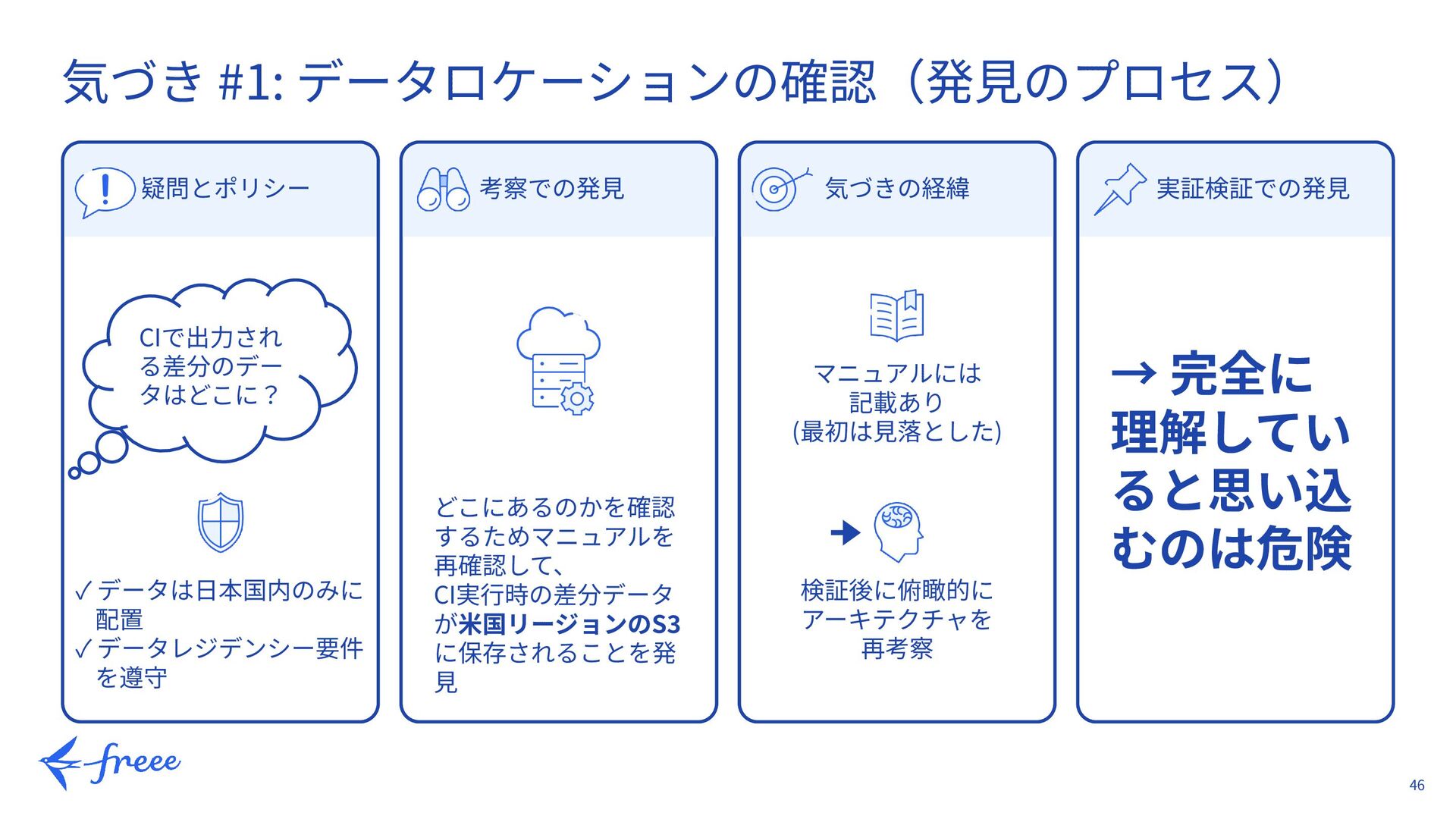 32. 46 気づき #1: データロケーションの確認(発⾒のプロセス) 疑問とポリシー CIで出⼒され る差分のデー タはどこに? ✓ データは⽇本国内のみに