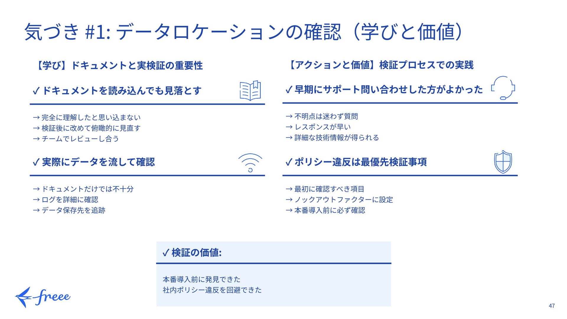 → チームでレビューし合う 【学び】ドキュメントと実検証の重要性 ✓ 検証の価値: 本番導⼊前に発⾒できた 社内ポリシー違反を回避できた ✓ 実際にデータを流して確認 → ドキュメントだけでは不⼗分 → ログを詳細に確認 → データ保存先を追跡 【アクションと価値】検証プロセスでの実践 ✓ 早期にサポート問い合わせした⽅がよかった → 不明点は迷わず質問 → レスポンスが早い → 詳細な技術情報が得られる ✓ ポリシー違反は最優先検証事項 → 最初に確認すべき項⽬ → ノックアウトファクターに設定 → 本番導⼊前に必ず確認