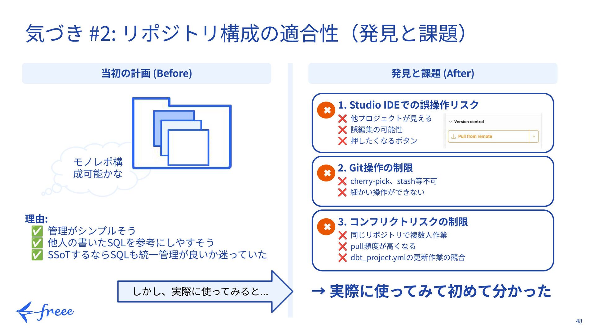 理由: ✅ 管理がシンプルそう ✅ 他⼈の書いたSQLを参考にしやすそう ✅ SSoTするならSQLも統⼀管理が良いか迷っていた しかし、実際に使ってみると... 1. Studio IDEでの誤操作リスク ❌ 他プロジェクトが⾒える ❌ 誤編集の可能性 ❌ 押したくなるボタン ✖ 2. Git操作の制限 ❌ cherry-pick、stash等不可 ❌ 細かい操作ができない ✖ 3. コンフリクトリスクの制限 ❌ 同じリポジトリで複数⼈作業 ❌ pull頻度が⾼くなる ❌ dbt_project.ymlの更新作業の競合 ✖ → 実際に使ってみて初めて分かった