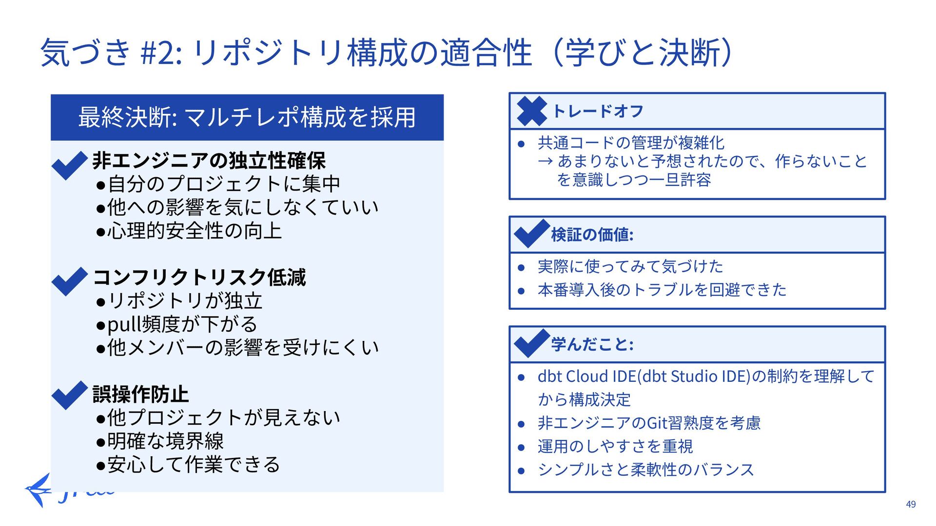•pull頻度が下がる •他メンバーの影響を受けにくい 誤操作防⽌ •他プロジェクトが⾒えない •明確な境界線 •安⼼して作業できる 最終決断: マルチレポ構成を採⽤ トレードオフ • 共通コードの管理が複雑化 → あまりないと予想されたので、作らないこと を意識しつつ⼀旦許容 検証の価値: • 実際に使ってみて気づけた • 本番導⼊後のトラブルを回避できた 学んだこと: • dbt Cloud IDE(dbt Studio IDE)の制約を理解して から構成決定 • ⾮エンジニアのGit習熟度を考慮 • 運⽤のしやすさを重視 • シンプルさと柔軟性のバランス