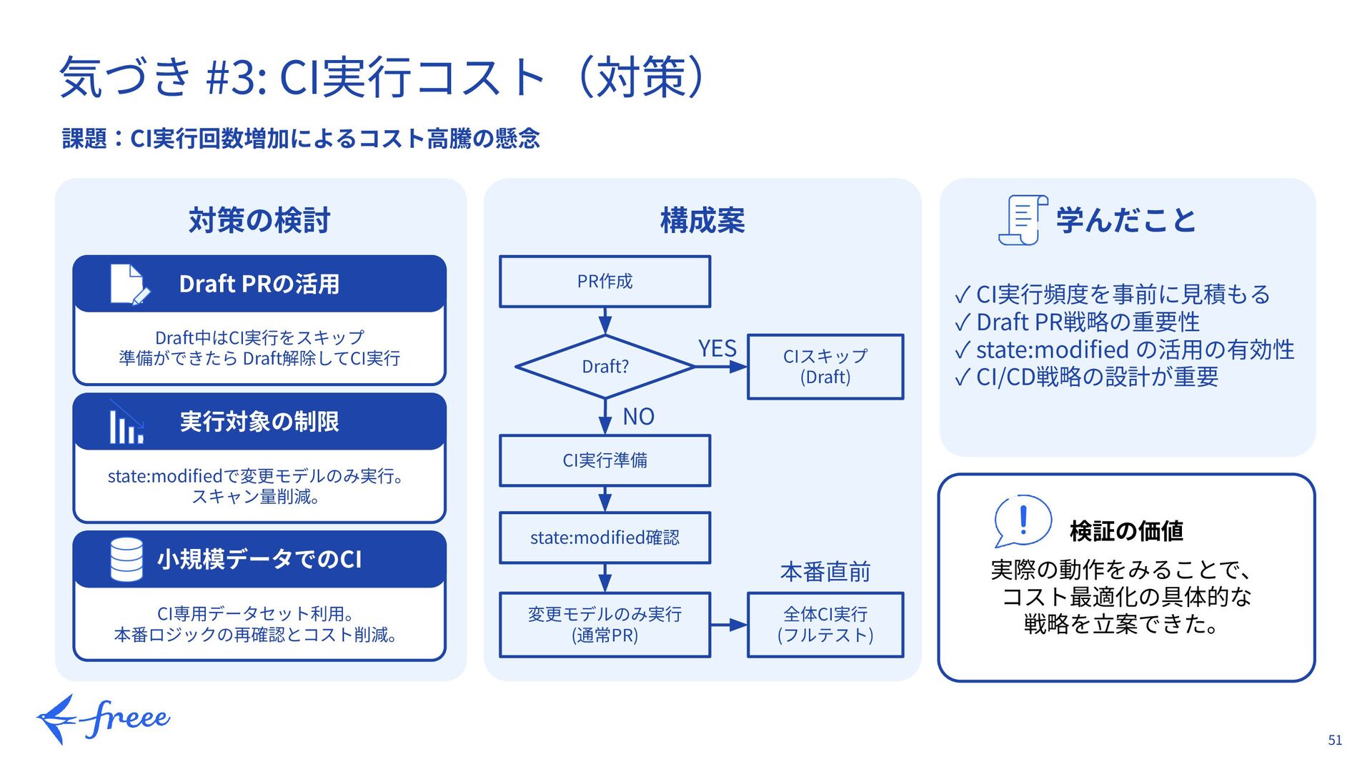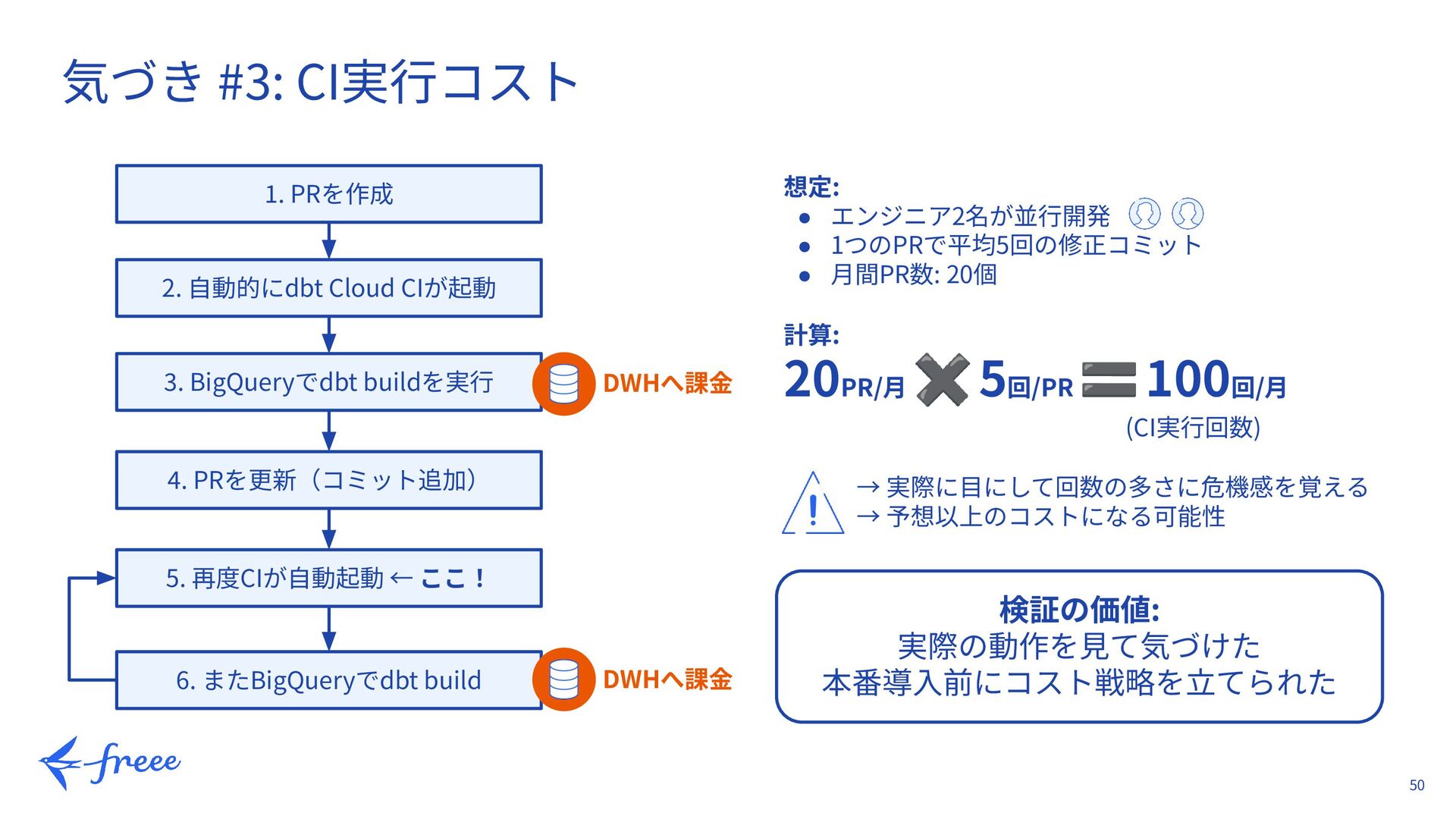 3. BigQueryでdbt buildを実⾏ 4. PRを更新(コミット追加) 5. 再度CIが⾃動起動 ← ここ! 6. またBigQueryでdbt build DWHへ課⾦ DWHへ課⾦ 想定: • エンジニア2名が並⾏開発 • 1つのPRで平均5回の修正コミット • ⽉間PR数: 20個 計算: 20PR/⽉ ✖ 5回/PR 🟰 100回/⽉ (CI実⾏回数) → 実際に⽬にして回数の多さに危機感を覚える → 予想以上のコストになる可能性 検証の価値: 実際の動作を⾒て気づけた 本番導⼊前にコスト戦略を⽴てられた