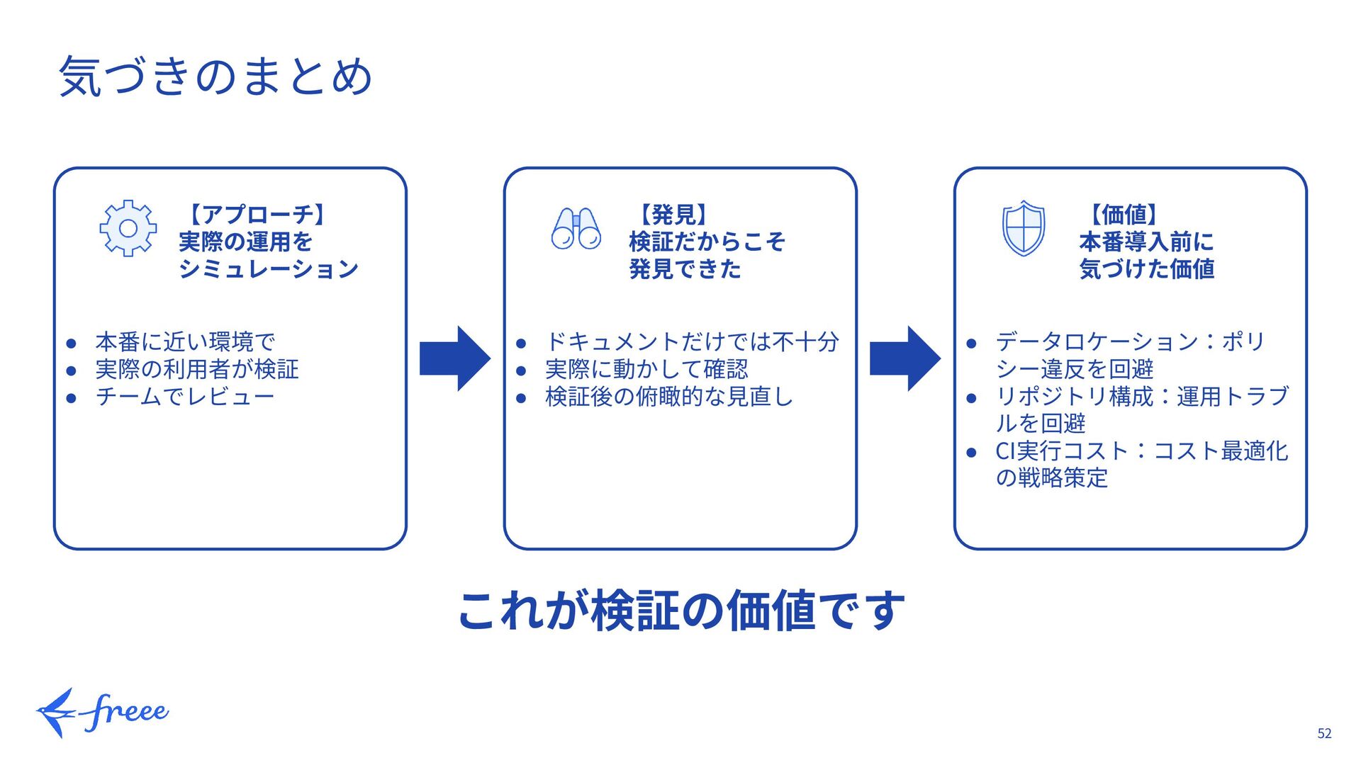 38. 52 これが検証の価値です 気づきのまとめ 【アプローチ】 実際の運⽤を シミュレーション 【発⾒】 検証だからこそ 発⾒できた 【価値】