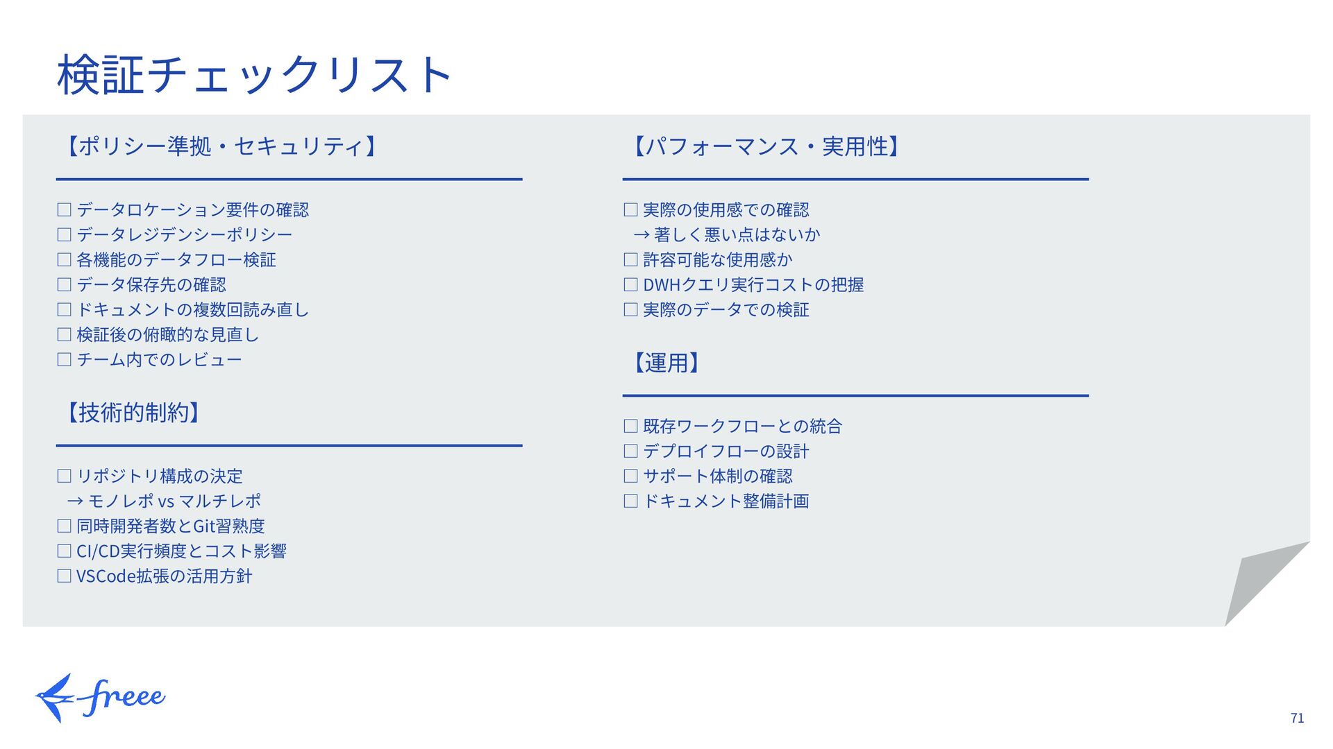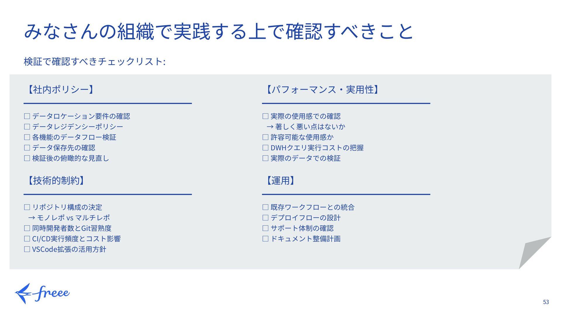 データ保存先の確認 □ ドキュメントの複数回読み直し □ 検証後の俯瞰的な⾒直し □ チーム内でのレビュー 【技術的制約】 ━━━━━━━━━━━━━━━━━━━━━ □ リポジトリ構成の決定 → モノレポ vs マルチレポ □ 同時開発者数とGit習熟度 □ CI/CD実⾏頻度とコスト影響 □ VSCode拡張の活⽤⽅針 検証チェックリスト 【パフォーマンス‧実⽤性】 ━━━━━━━━━━━━━━━━━━━━━ □ 実際の使⽤感での確認 → 著しく悪い点はないか □ 許容可能な使⽤感か □ DWHクエリ実⾏コストの把握 □ 実際のデータでの検証 【運⽤】 ━━━━━━━━━━━━━━━━━━━━━ □ 既存ワークフローとの統合 □ デプロイフローの設計 □ サポート体制の確認 □ ドキュメント整備計画