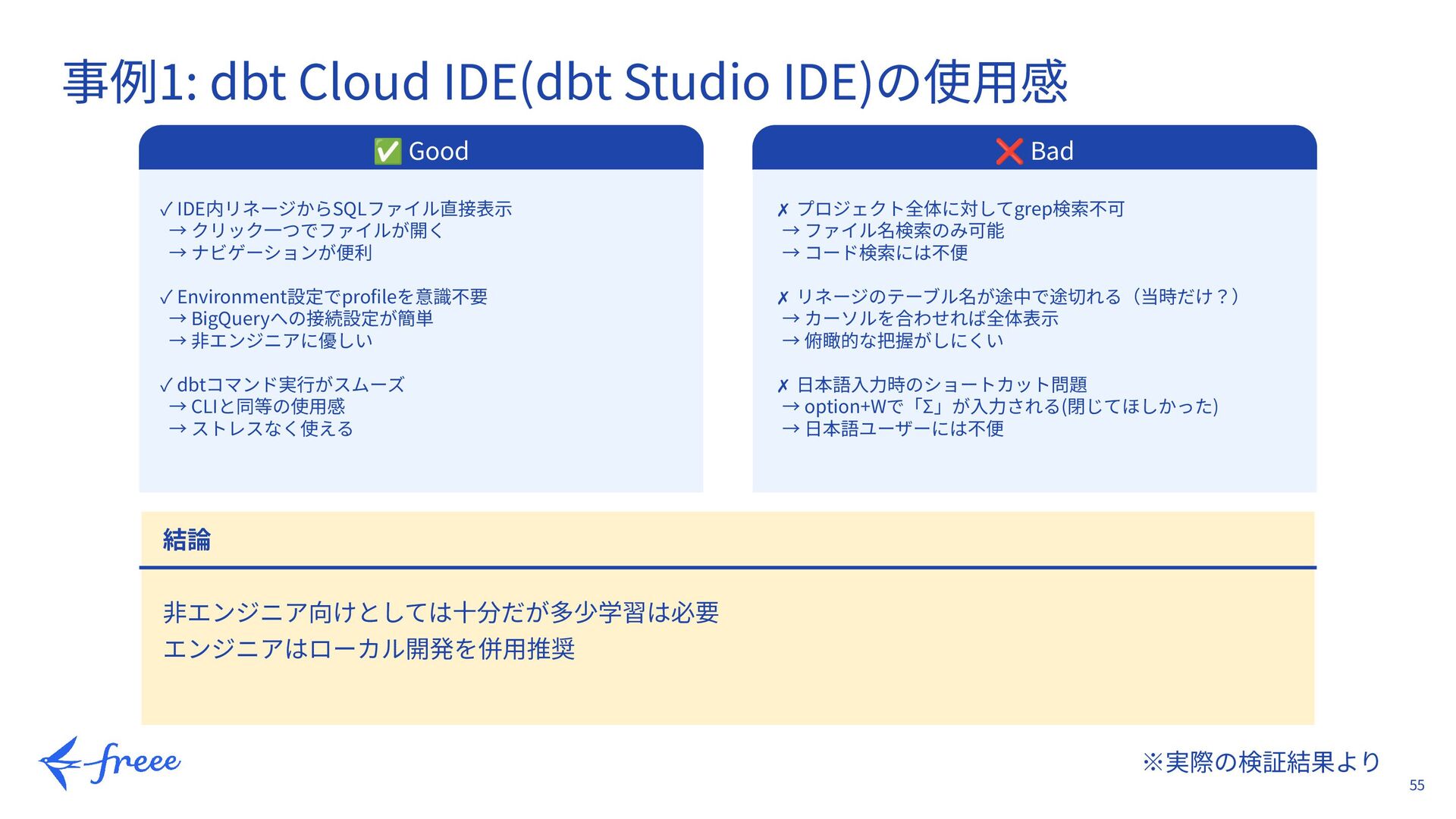 40. 55 ※実際の検証結果より 事例1: dbt Cloud IDE(dbt Studio IDE)の使⽤感 ✅ Good