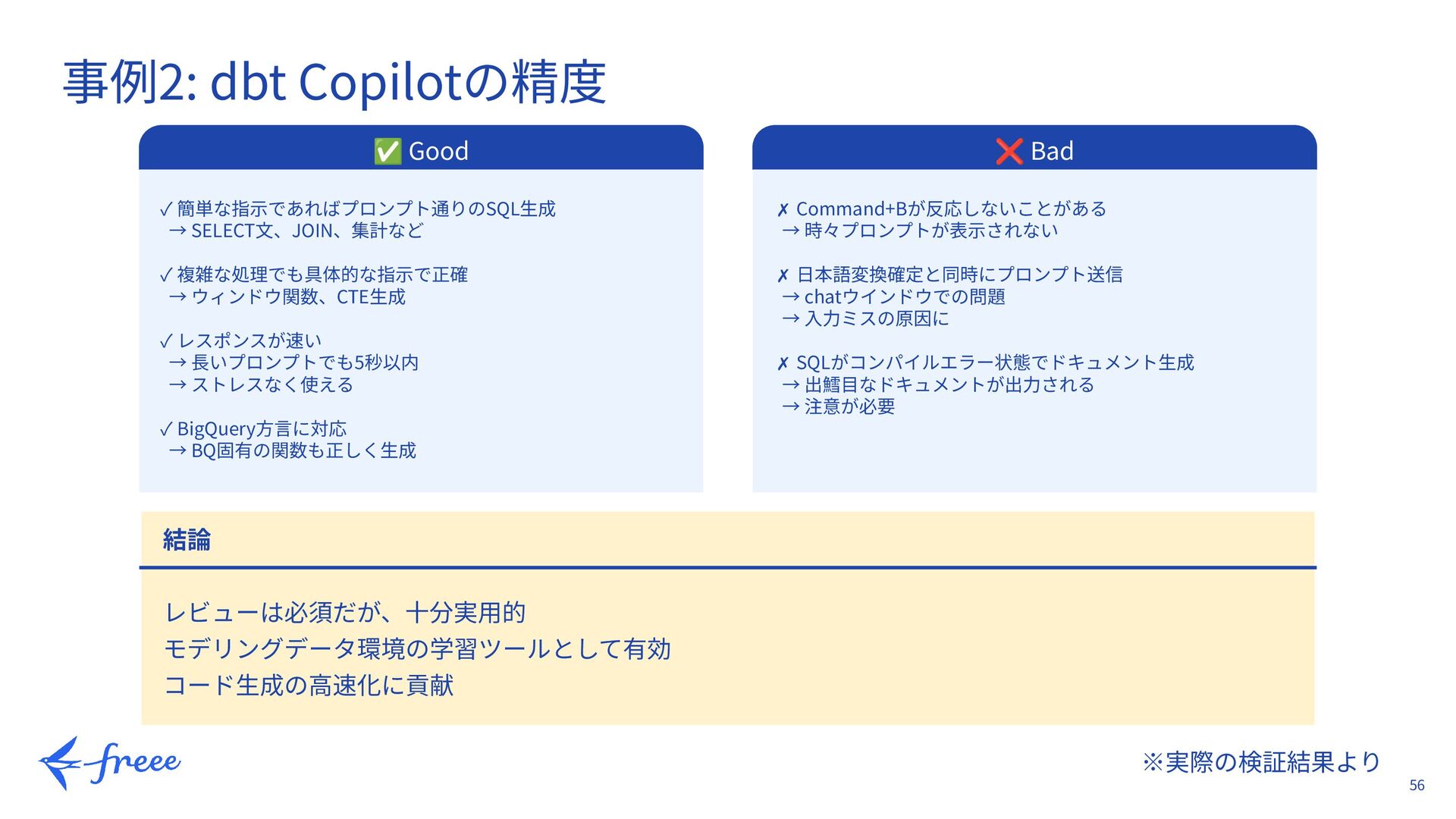 41. 56 ※実際の検証結果より 事例2: dbt Copilotの精度 ✅ Good ✓ 簡単な指⽰であればプロンプト通りのSQL⽣成 →