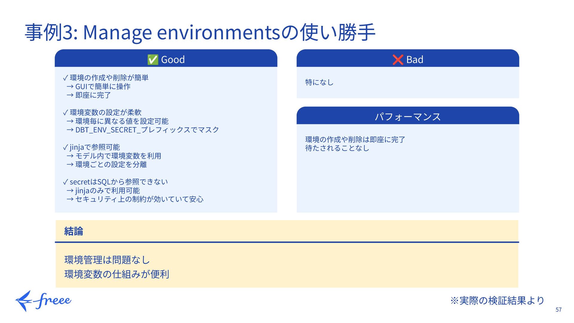 42. 57 ※実際の検証結果より 事例3: Manage environmentsの使い勝⼿ ✅ Good ✓ 環境の作成や削除が簡単 →