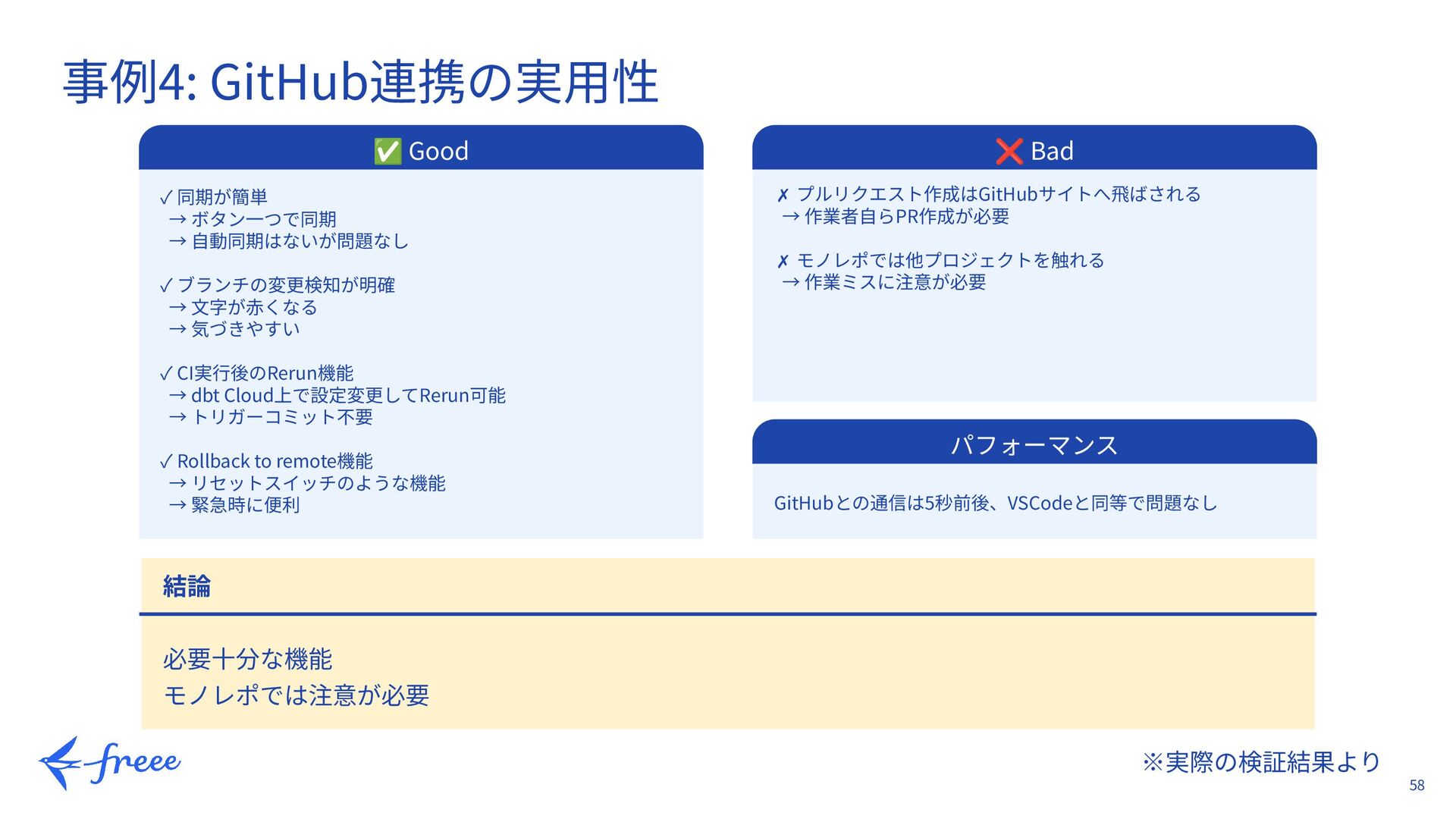 43. 58 ※実際の検証結果より 事例4: GitHub連携の実⽤性 ✅ Good ✓ 同期が簡単 → ボタン⼀つで同期
