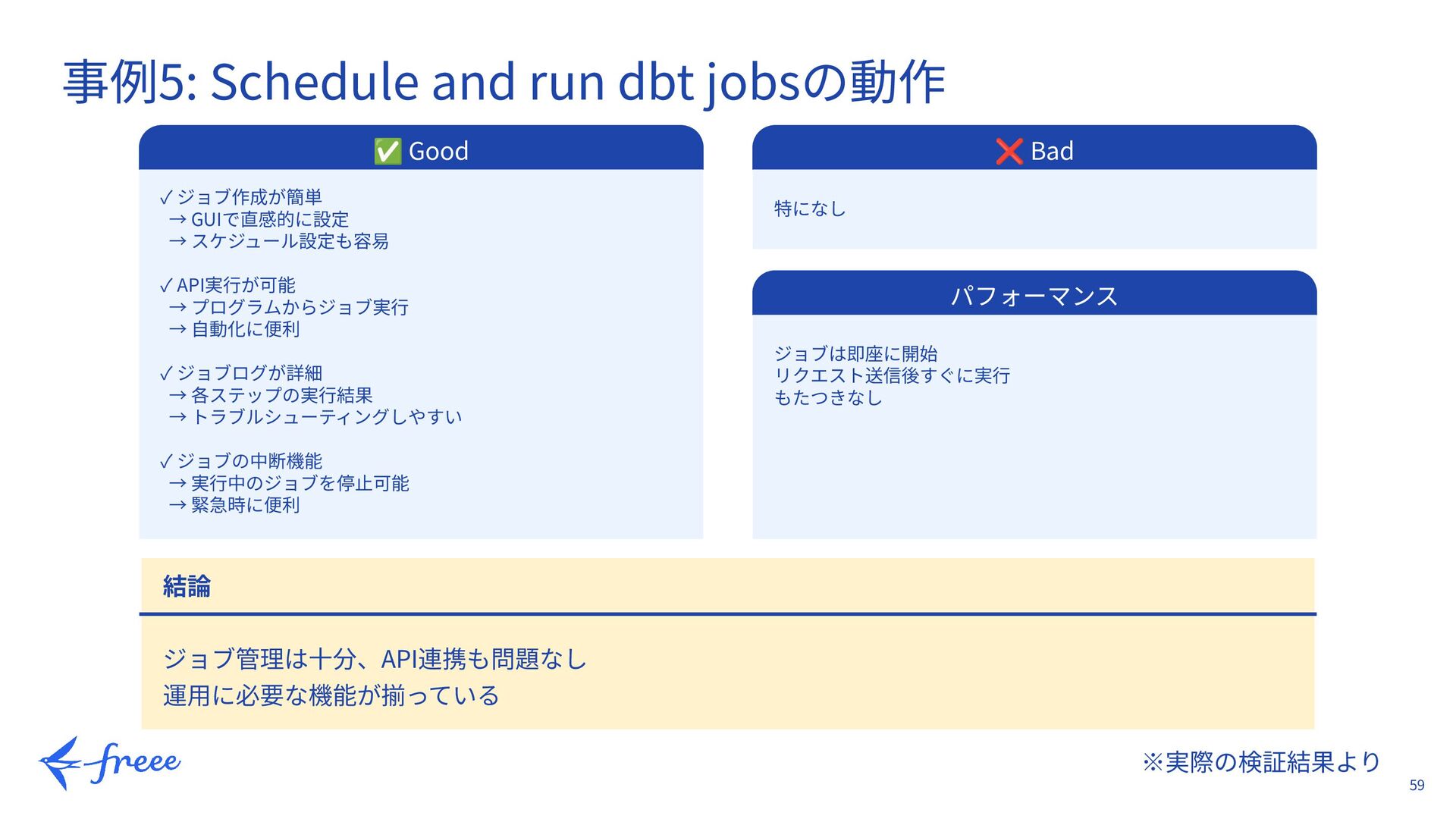 44. 59 ※実際の検証結果より 事例5: Schedule and run dbt jobsの動作 ✅ Good