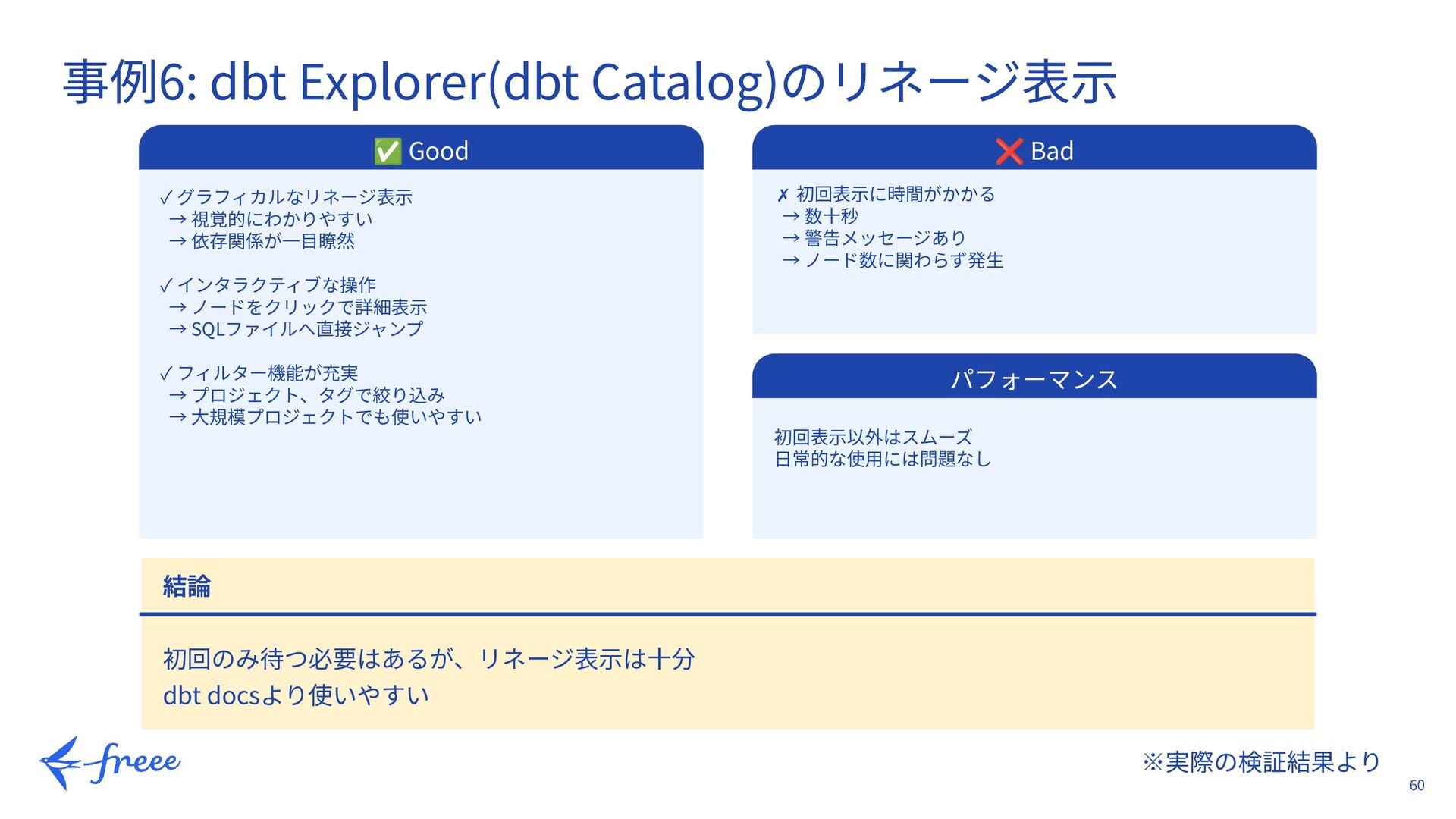 45. 60 ※実際の検証結果より 事例6: dbt Explorer(dbt Catalog)のリネージ表⽰ ✅ Good ✓ グラフィカルなリネージ表⽰