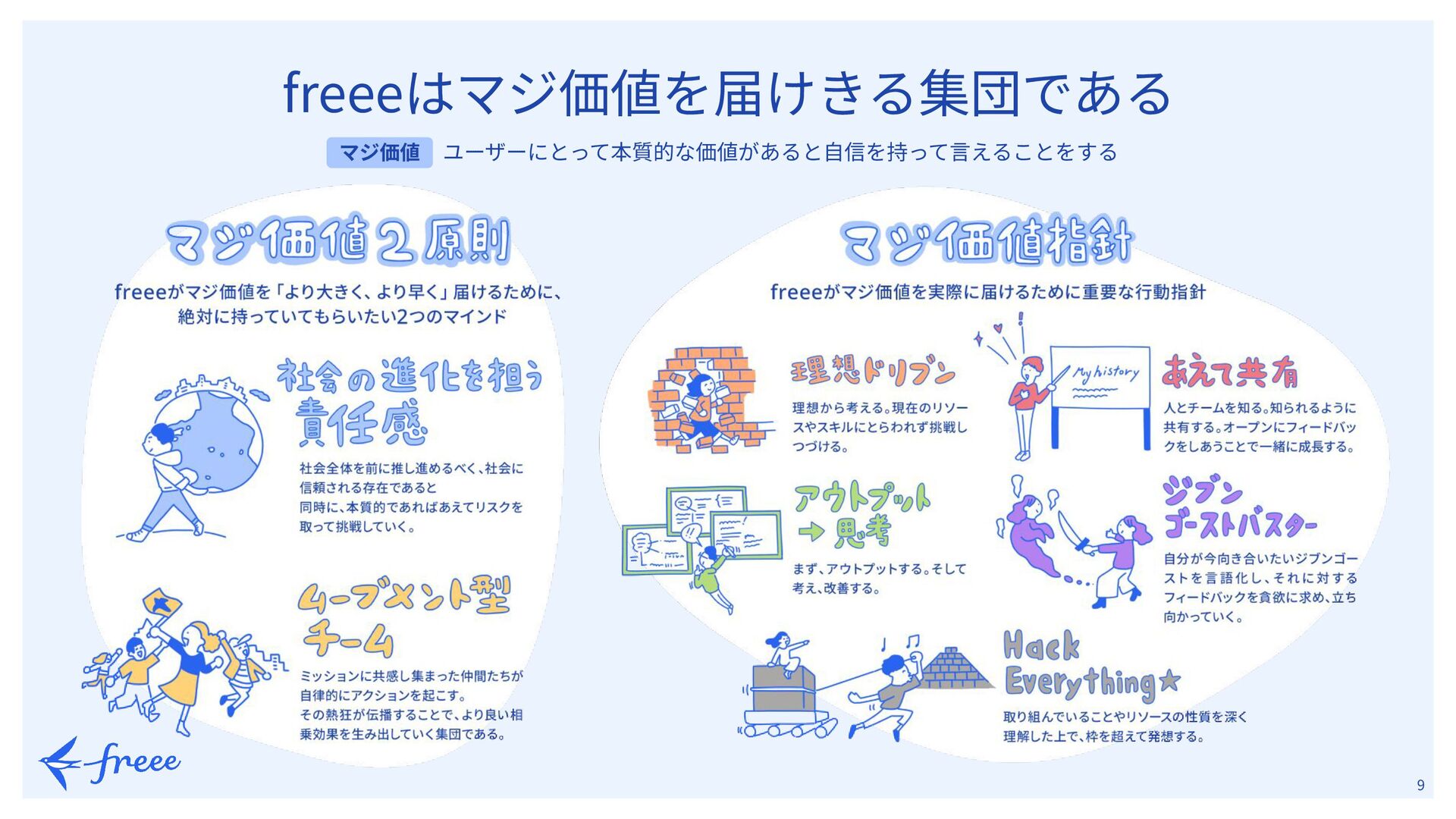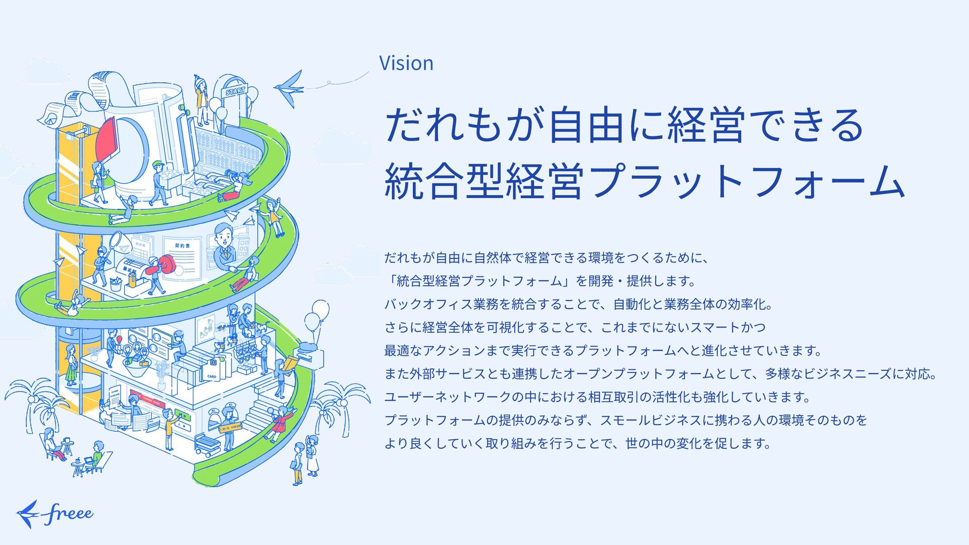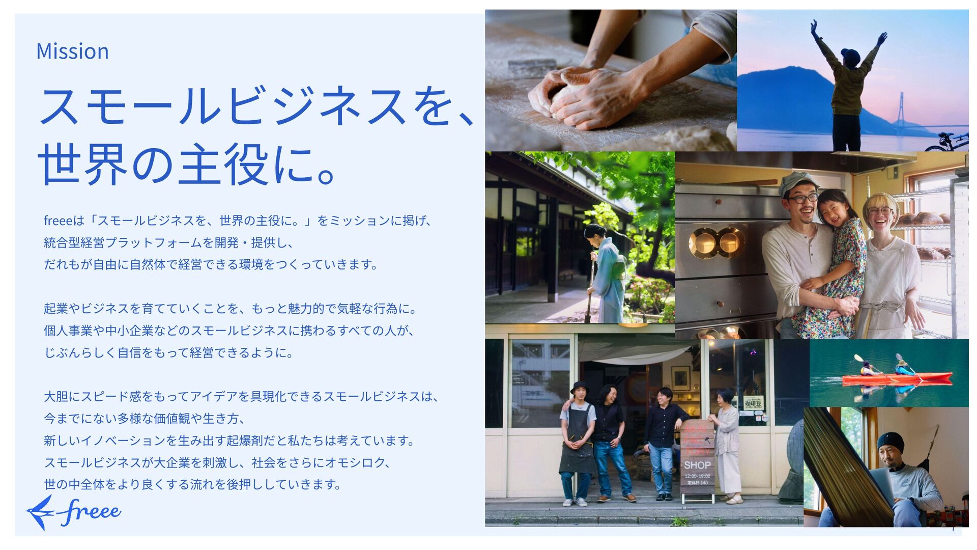 4.   7 Mission スモールビジネスを、 世界の主役に。 freeeは「スモールビジネスを、世界の主役に。」をミッションに掲げ、 統合型経営プラットフォームを開発‧提供し、 だれもが⾃由に⾃然体で経営できる環境をつくっていきます。 起業やビジネスを育てていくことを、もっと魅⼒的で気軽な⾏為に。 個⼈事業や中⼩企業などのスモールビジネスに携わるすべての⼈が、