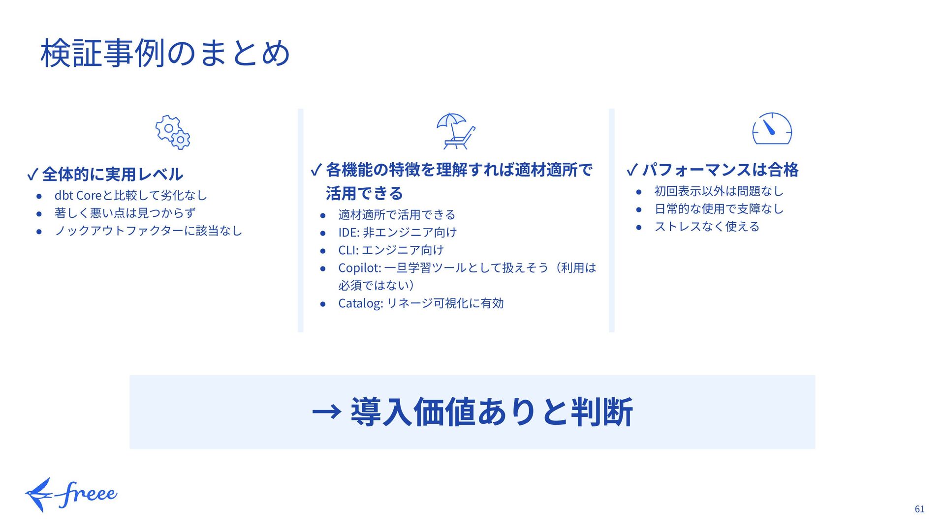 46. 61 検証事例のまとめ ✓ 全体的に実⽤レベル • dbt Coreと⽐較して劣化なし • 著しく悪い点は⾒つからず •
