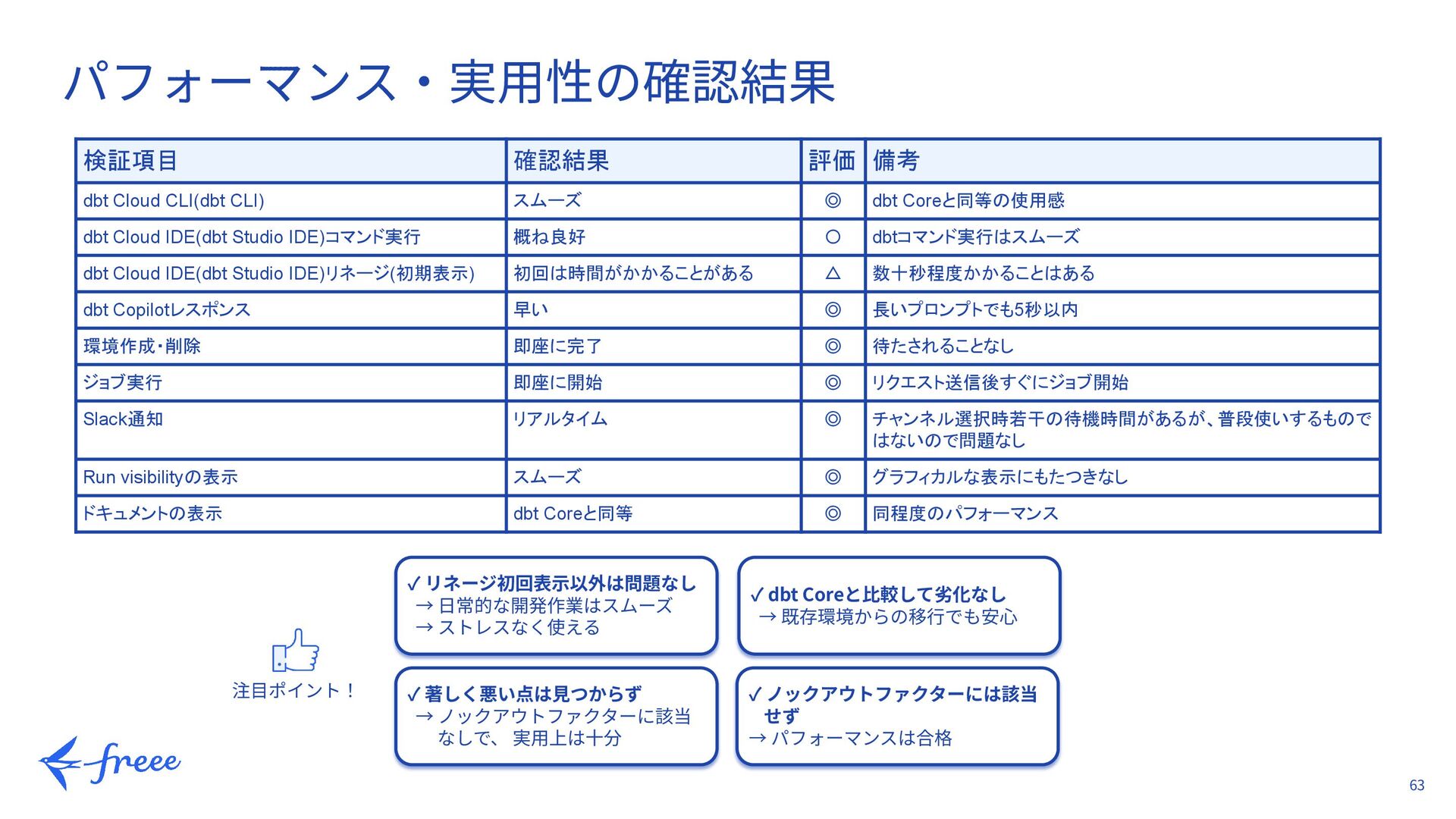 スムーズ ◎ dbt Coreと同等の使用感 dbt Cloud IDE(dbt Studio IDE)コマンド実行 概ね良好 〇 dbtコマンド実行はスムーズ dbt Cloud IDE(dbt Studio IDE)リネージ(初期表示) 初回は時間がかかることがある △ 数十秒程度かかることはある dbt Copilotレスポンス 早い ◎ 長いプロンプトでも5秒以内 環境作成・削除 即座に完了 ◎ 待たされることなし ジョブ実行 即座に開始 ◎ リクエスト送信後すぐにジョブ開始 Slack通知 リアルタイム ◎ チャンネル選択時若干の待機時間があるが、普段使いするもので はないので問題なし Run visibilityの表示 スムーズ ◎ グラフィカルな表示にもたつきなし ドキュメントの表示 dbt Coreと同等 ◎ 同程度のパフォーマンス ✓ リネージ初回表⽰以外は問題なし → ⽇常的な開発作業はスムーズ → ストレスなく使える 注⽬ポイント! ✓ 著しく悪い点は⾒つからず → ノックアウトファクターに該当 なしで、 実⽤上は⼗分 ✓ dbt Coreと⽐較して劣化なし → 既存環境からの移⾏でも安⼼ ✓ ノックアウトファクターには該当 せず → パフォーマンスは合格