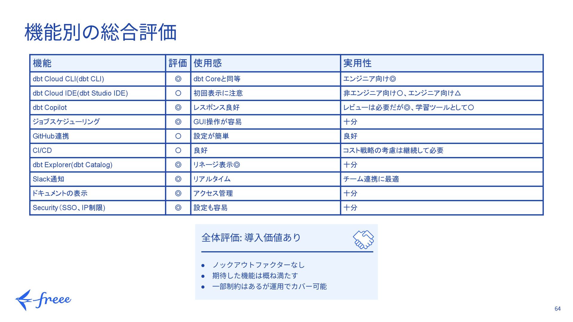 機能別の総合評価 機能 評価 使用感 実用性 dbt Cloud CLI(dbt CLI) ◎ dbt Coreと同等 エンジニア向け◎ dbt Cloud IDE(dbt Studio IDE) 〇 初回表示に注意 非エンジニア向け〇、エンジニア向け△ dbt Copilot ◎ レスポンス良好 レビューは必要だが◎、学習ツールとして〇 ジョブスケジューリング ◎ GUI操作が容易 十分 GitHub連携 〇 設定が簡単 良好 CI/CD 〇 良好 コスト戦略の考慮は継続して必要 dbt Explorer(dbt Catalog) ◎ リネージ表示◎ 十分 Slack通知 ◎ リアルタイム チーム連携に最適 ドキュメントの表示 ◎ アクセス管理 十分 Security(SSO、IP制限) ◎ 設定も容易 十分