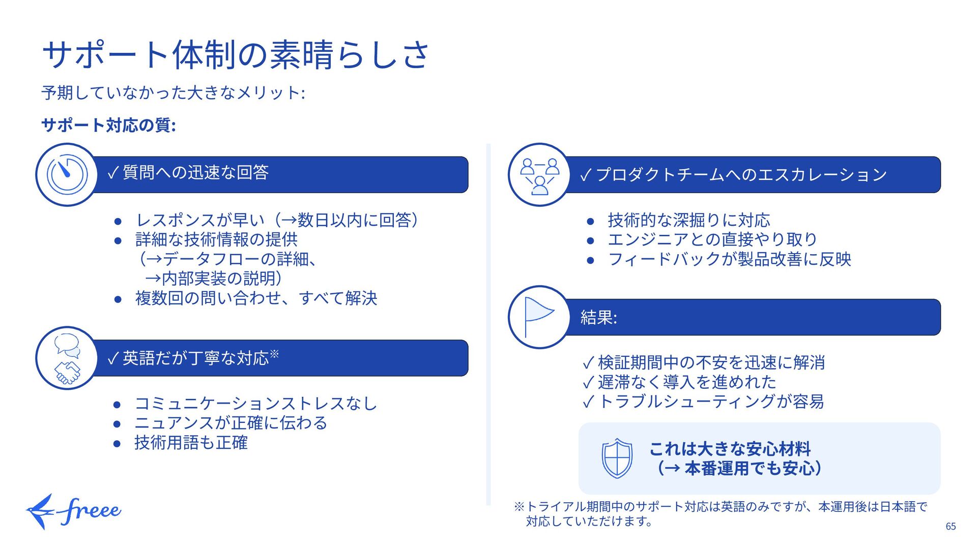 49. 65 ✓ プロダクトチームへのエスカレーション ✓ 質問への迅速な回答 予期していなかった⼤きなメリット: サポート体制の素晴らしさ ✓ 英語だが丁寧な対応※ 結果: