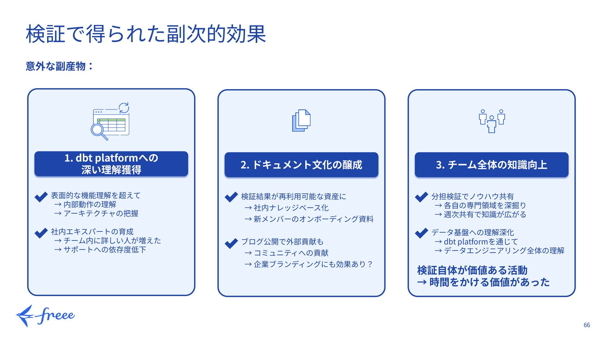 → アーキテクチャの把握 社内エキスパートの育成 → チーム内に詳しい⼈が増えた → サポートへの依存度低下 2. ドキュメント⽂化の醸成 検証結果が再利⽤可能な資産に → 社内ナレッジベース化 → 新メンバーのオンボーディング資料 ブログ公開で外部貢献も → コミュニティへの貢献 → 企業ブランディングにも効果あり? 3. チーム全体の知識向上 分担検証でノウハウ共有 → 各⾃の専⾨領域を深掘り → 週次共有で知識が広がる データ基盤への理解深化 → dbt platformを通じて → データエンジニアリング全体の理解 検証⾃体が価値ある活動 → 時間をかける価値があった