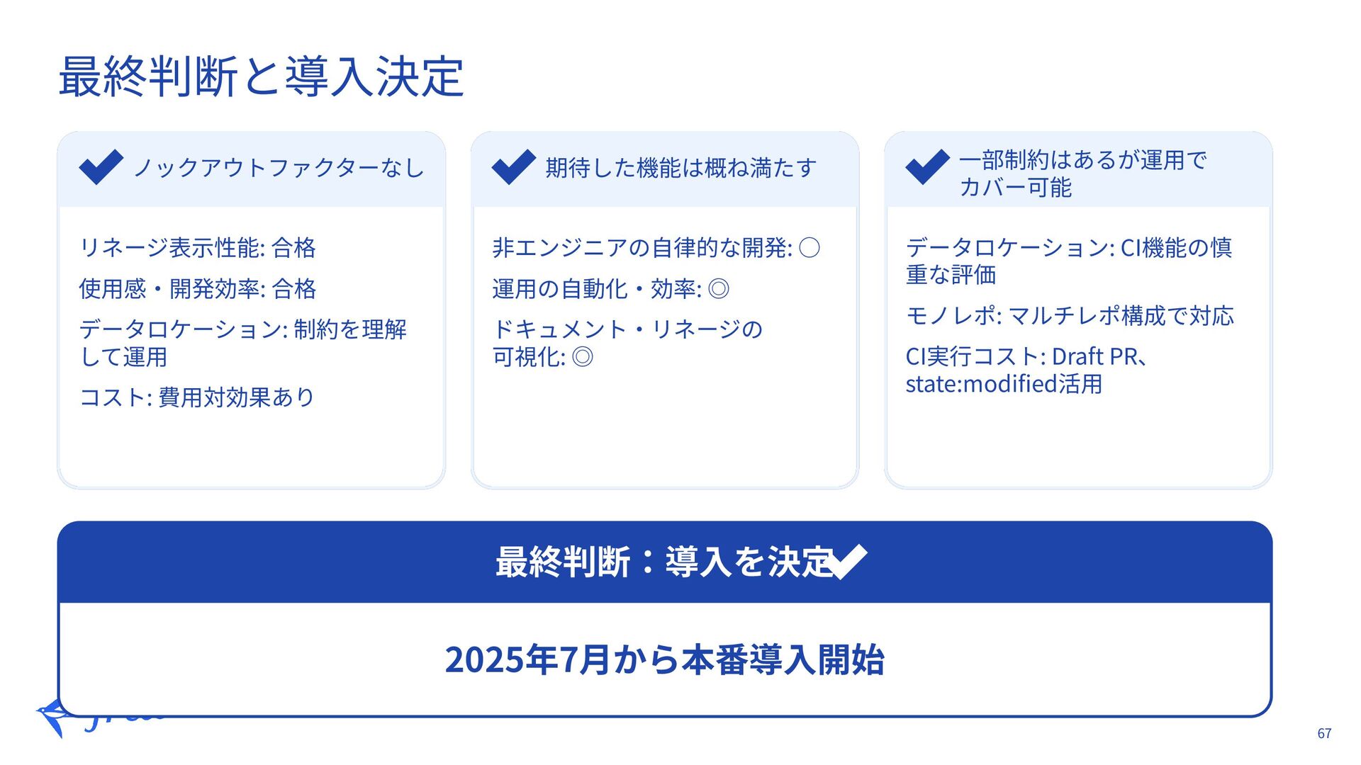 51. 67 最終判断と導⼊決定 ノックアウトファクターなし 期待した機能は概ね満たす ⼀部制約はあるが運⽤で カバー可能 最終判断:導⼊を決定  2025年7⽉から本番導⼊開始 リネージ表⽰性能: 合格