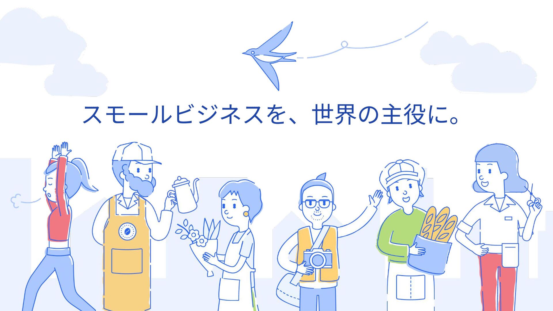 じぶんらしく⾃信をもって経営できるように。 ⼤胆にスピード感をもってアイデアを具現化できるスモールビジネスは、 今までにない多様な価値観や⽣き⽅、 新しいイノベーションを⽣み出す起爆剤だと私たちは考えています。 スモールビジネスが⼤企業を刺激し、社会をさらにオモシロク、 世の中全体をより良くする流れを後押ししていきます。