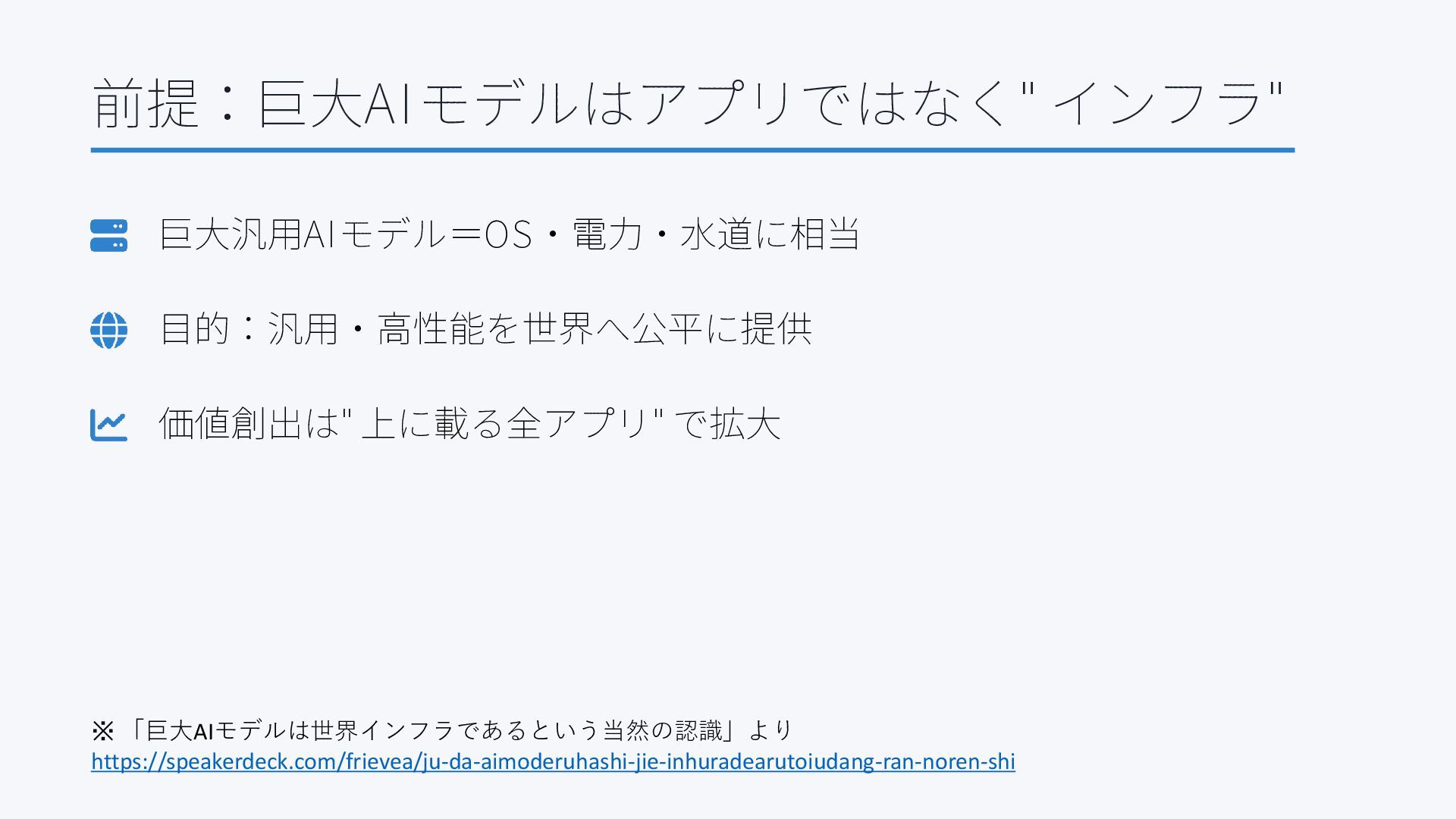 前提:巨大AIモデルはアプリではなく"インフラ" 巨大汎用AIモデル=OS・電力・水道に相当 目的:汎用・高性能を世界へ公平に提供 価値創出は"上に載る全アプリ"で拡大 ※ 「巨大AIモデルは世界インフラであるという当然の認識」より https://speakerdeck.com/frievea/ju-da-aimoderuhashi-jie-inhuradearutoiudang-ran-noren-shi