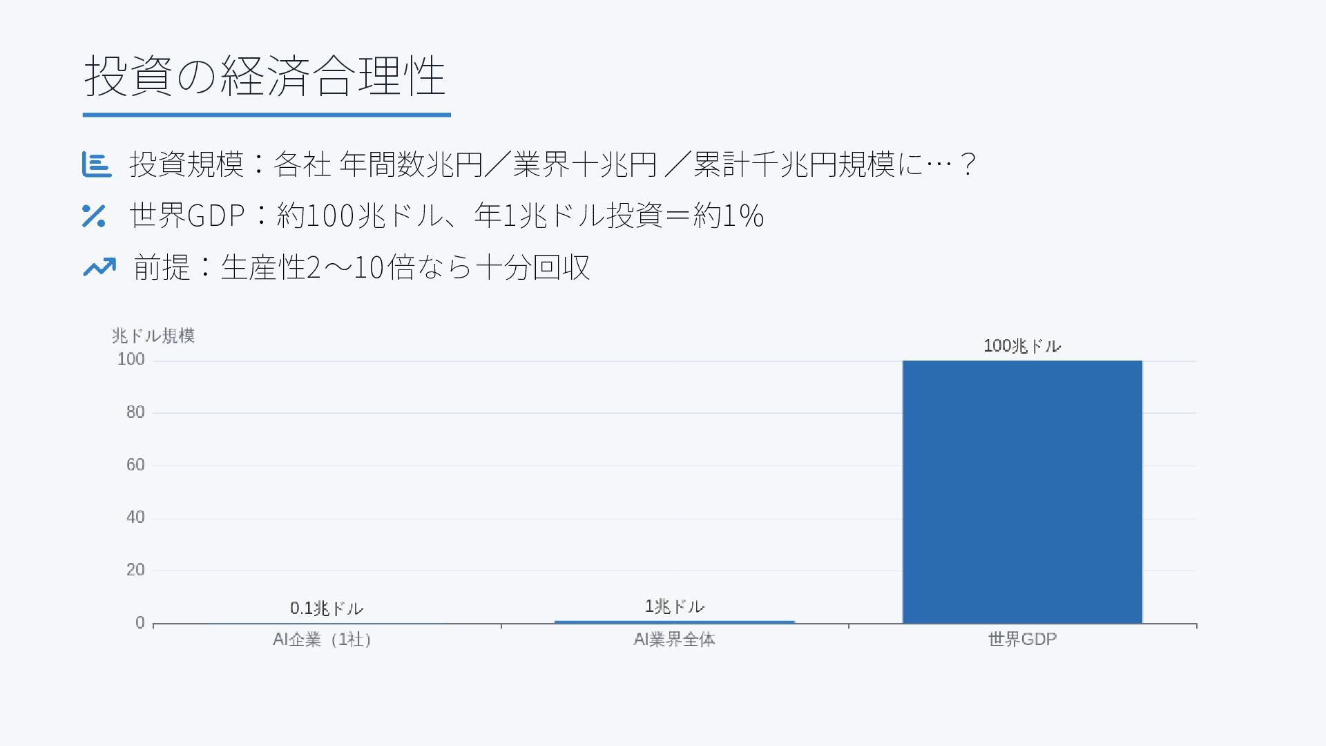 投資の経済合理性 投資規模:各社 年間数兆円/業界十兆円 /累計千兆円規模に…? 世界GDP:約100兆ドル、年1兆ドル投資=約1% 前提:生産性2〜10倍なら十分回収