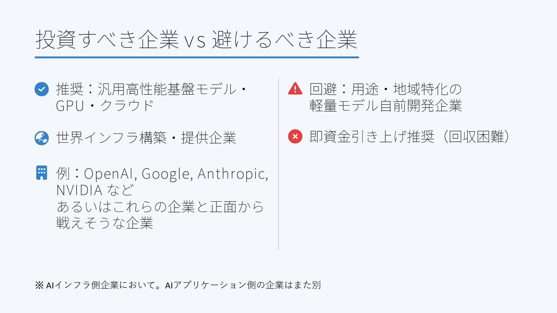 投資すべき企業 vs 避けるべき企業 推奨:汎用高性能基盤モデル・ GPU・クラウド 例:OpenAI, Google, Anthropic, NVIDIA など