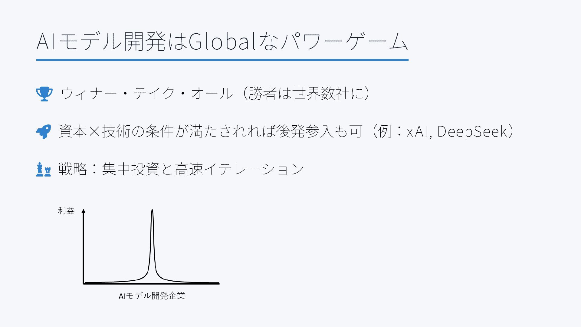 AIモデル開発はGlobalなパワーゲーム ウィナー・テイク・オール(勝者は世界数社に) 資本×技術の条件が満たされれば後発参入も可(例:xAI, DeepSeek) 戦略:集中投資と高速イテレーション 利益 AIモデル開発企業