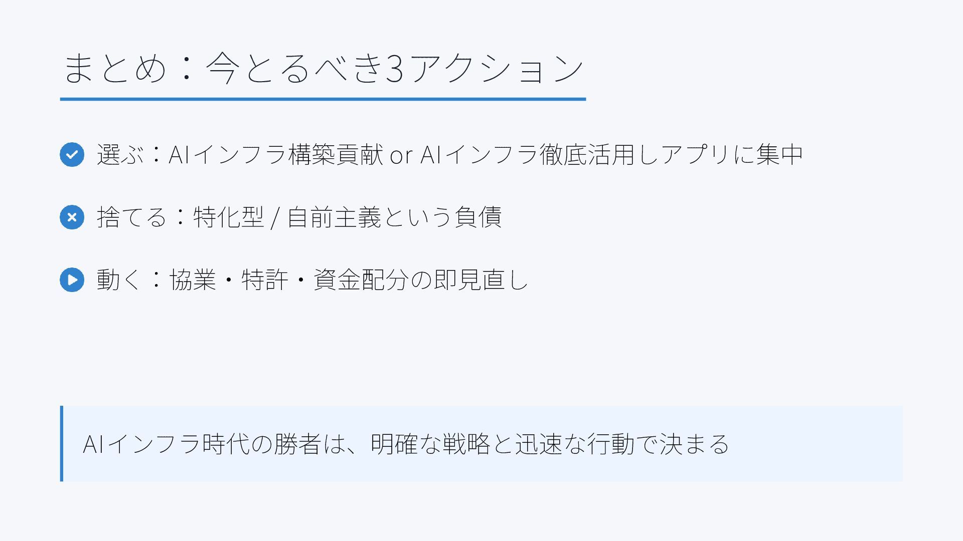 まとめ:今とるべき3アクション 選ぶ:AIインフラ構築貢献 or AIインフラ徹底活用しアプリに集中 捨てる:特化型 / 自前主義という負債 動く:協業・特許・資金配分の即見直し AIインフラ時代の勝者は、明確な戦略と迅速な行動で決まる