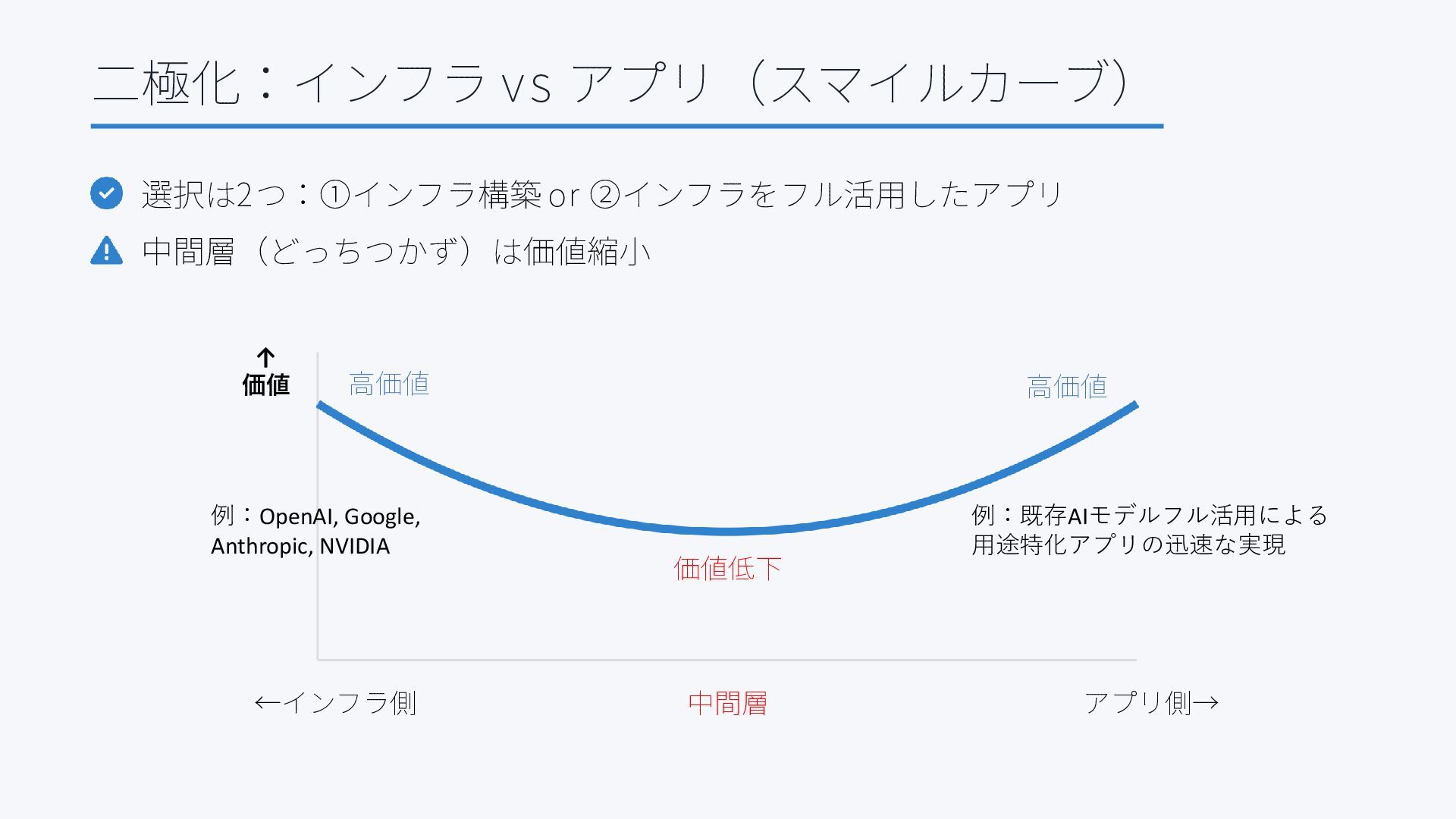 二極化:インフラ vs アプリ(スマイルカーブ) 選択は2つ:①インフラ構築 or ②インフラをフル活用したアプリ 中間層(どっちつかず)は価値縮小 ↑ 価値 ←インフラ側