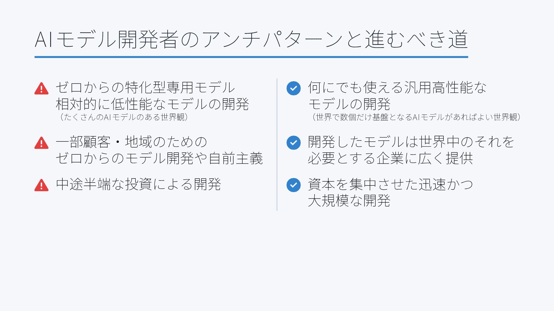 AIモデル開発者のアンチパターンと進むべき道 中途半端な投資による開発 何にでも使える汎用高性能な モデルの開発 (世界で数個だけ基盤となるAIモデルがあればよい世界観) 開発したモデルは世界中のそれを 必要とする企業に広く提供 資本を集中させた迅速かつ 大規模な開発 ゼロからの特化型専用モデル