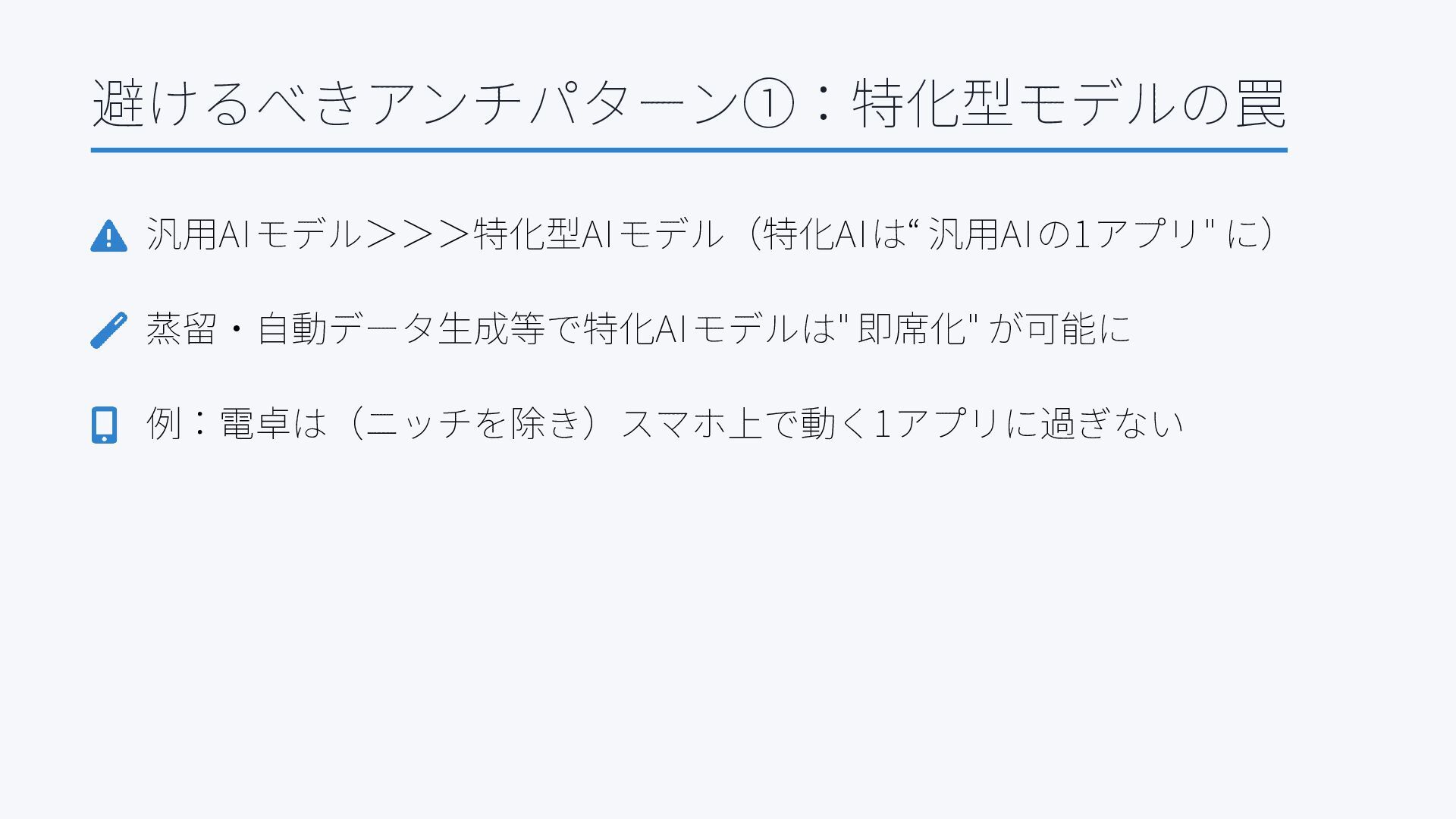 避けるべきアンチパターン①:特化型モデルの罠 汎用AIモデル>>>特化型AIモデル(特化AIは“汎用AIの1アプリ"に) 蒸留・自動データ生成等で特化AIモデルは"即席化"が可能に 例:電卓は(ニッチを除き)スマホ上で動く1アプリに過ぎない