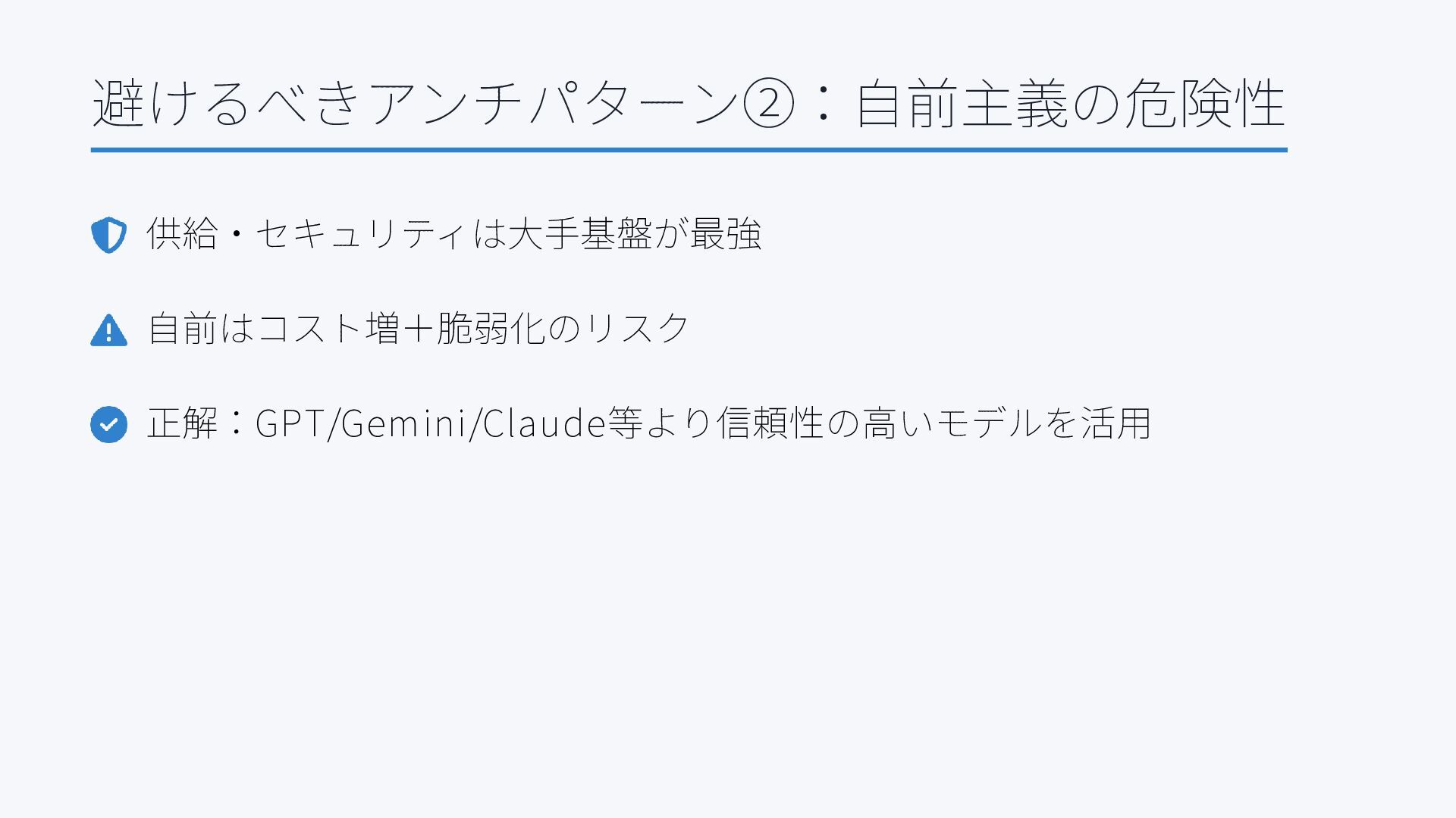 避けるべきアンチパターン②:自前主義の危険性 供給・セキュリティは大手基盤が最強 自前はコスト増+脆弱化のリスク 正解:GPT/Gemini/Claude等より信頼性の高いモデルを活用