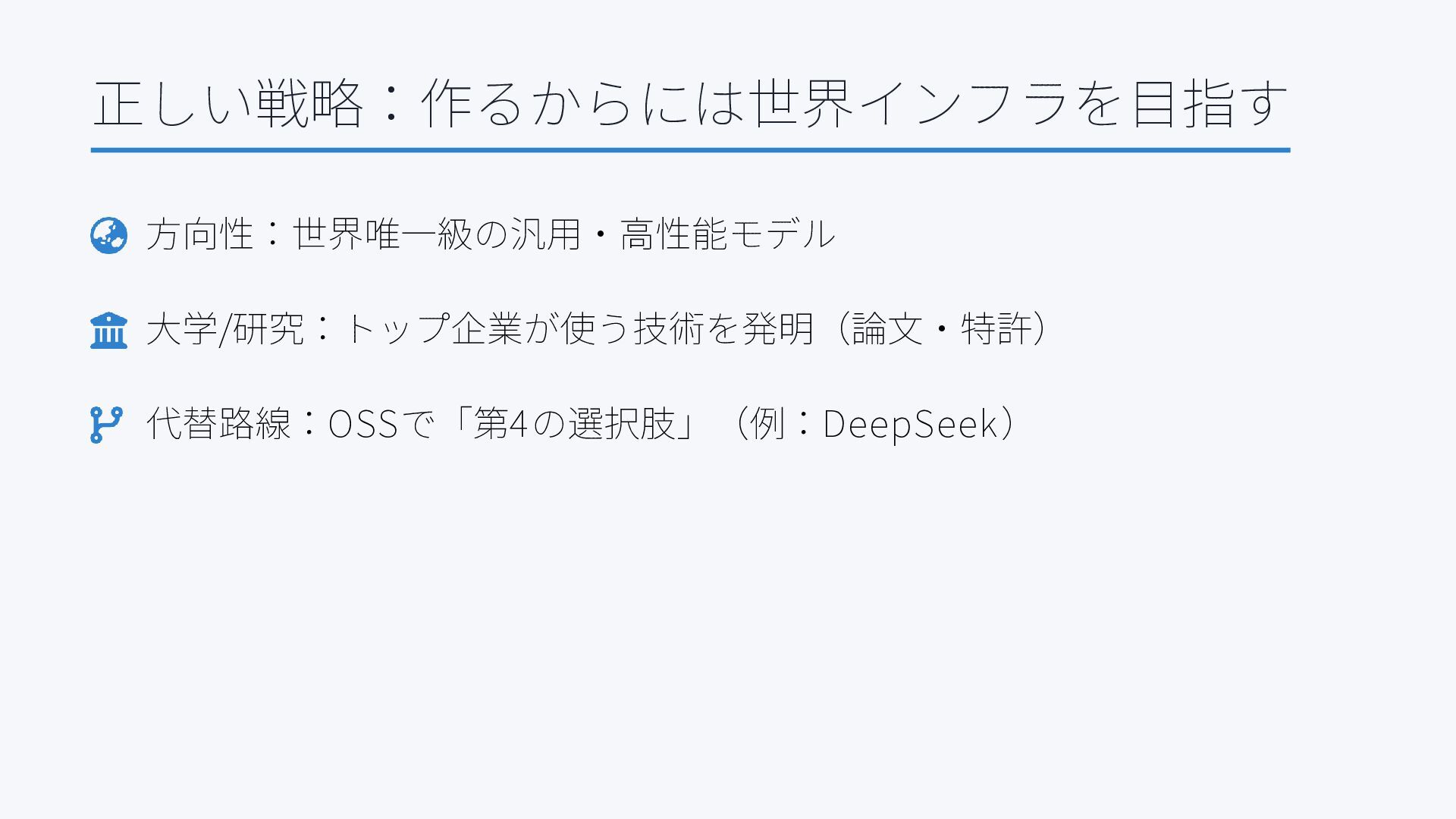 正しい戦略:作るからには世界インフラを目指す 方向性:世界唯一級の汎用・高性能モデル 大学/研究:トップ企業が使う技術を発明(論文・特許) 代替路線:OSSで「第4の選択肢」(例:DeepSeek)