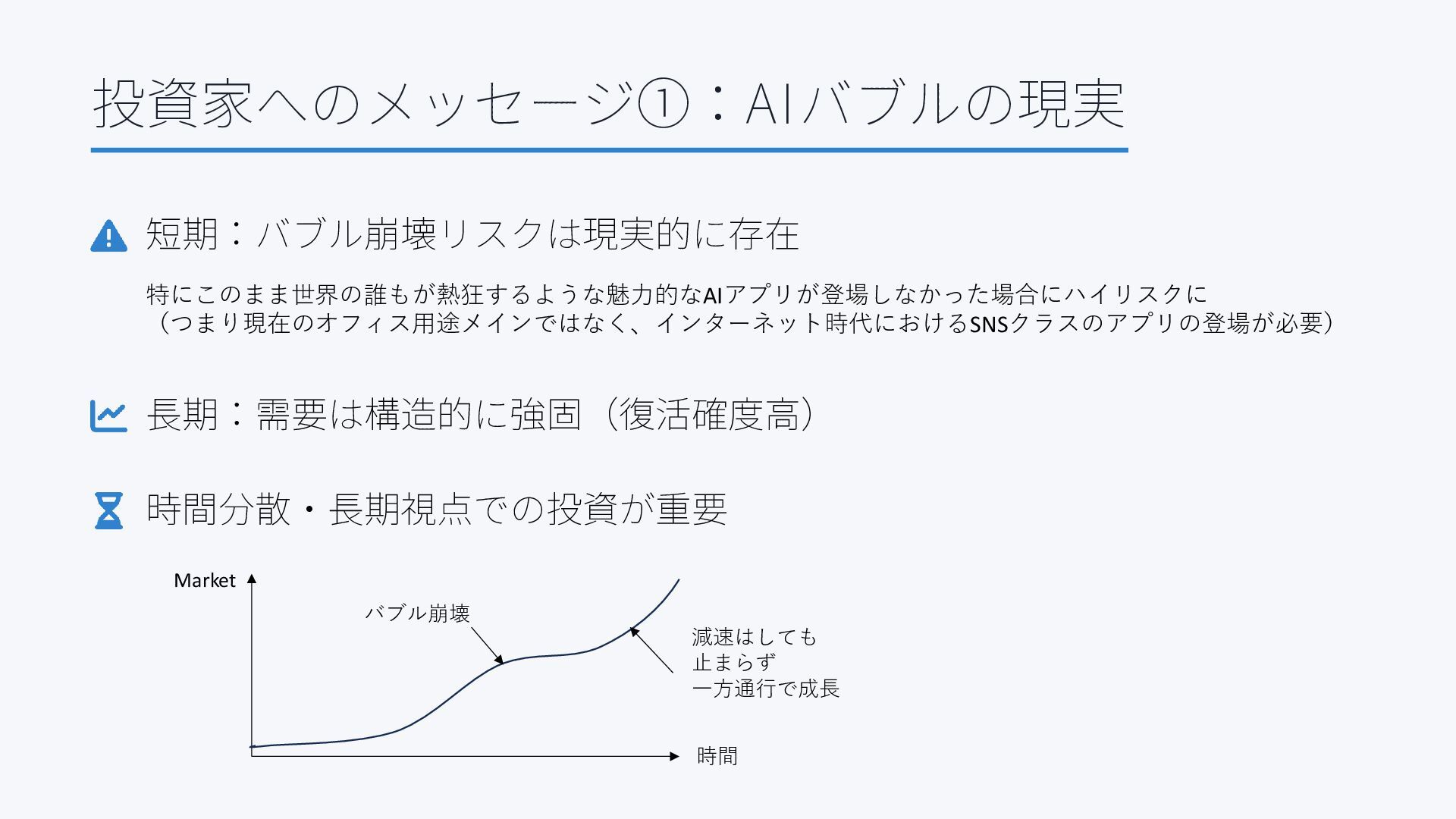 投資家へのメッセージ①:AIバブルの現実 短期:バブル崩壊リスクは現実的に存在 長期:需要は構造的に強固(復活確度高) 時間分散・長期視点での投資が重要 特にこのまま世界の誰もが熱狂するような魅力的なAIアプリが登場しなかった場合にハイリスクに (つまり現在のオフィス用途メインではなく、インターネット時代におけるSNSクラスのアプリの登場が必要) 時間 Market バブル崩壊 減速はしても