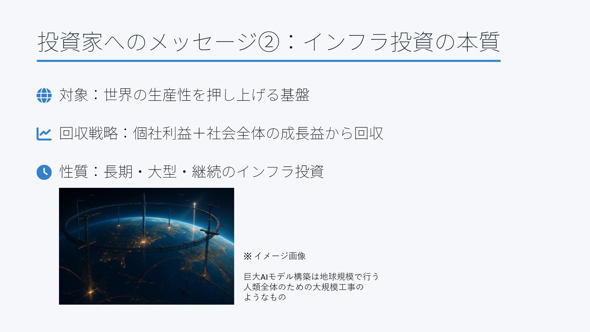 投資家へのメッセージ②:インフラ投資の本質 対象:世界の生産性を押し上げる基盤 回収戦略:個社利益+社会全体の成長益から回収 性質:長期・大型・継続のインフラ投資 ※ イメージ画像 巨大AIモデル構築は地球規模で行う 人類全体のための大規模工事の ようなもの