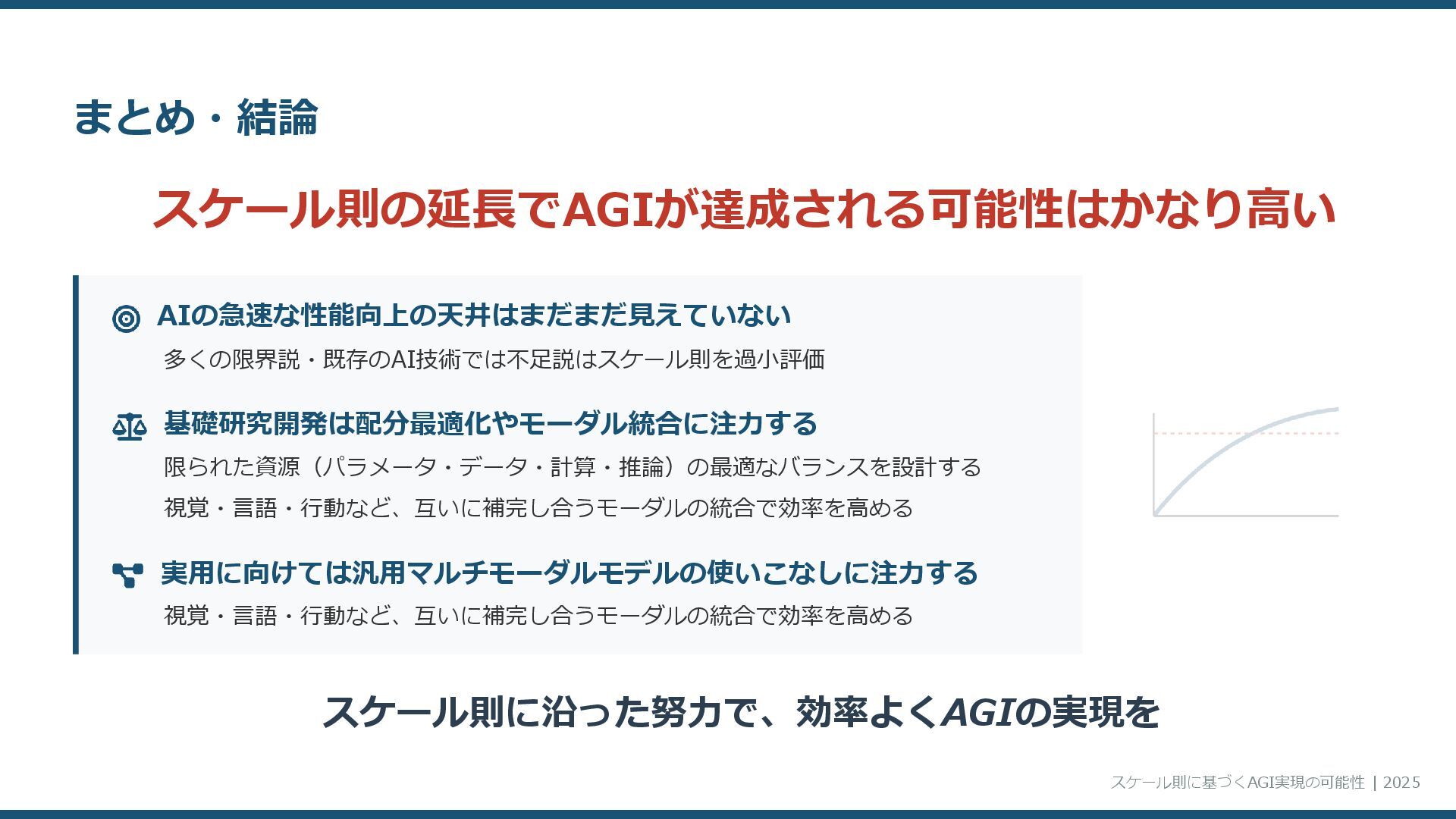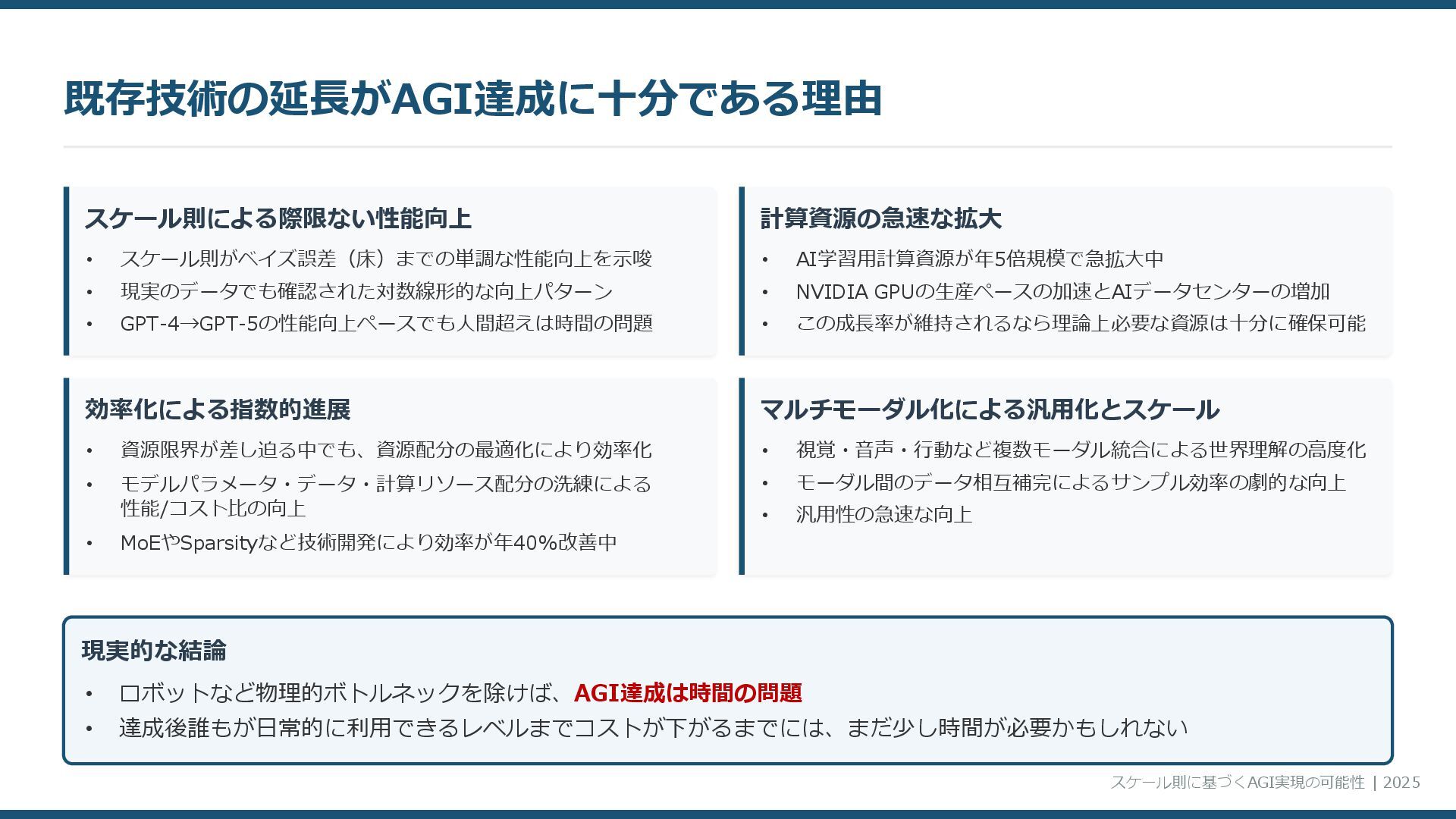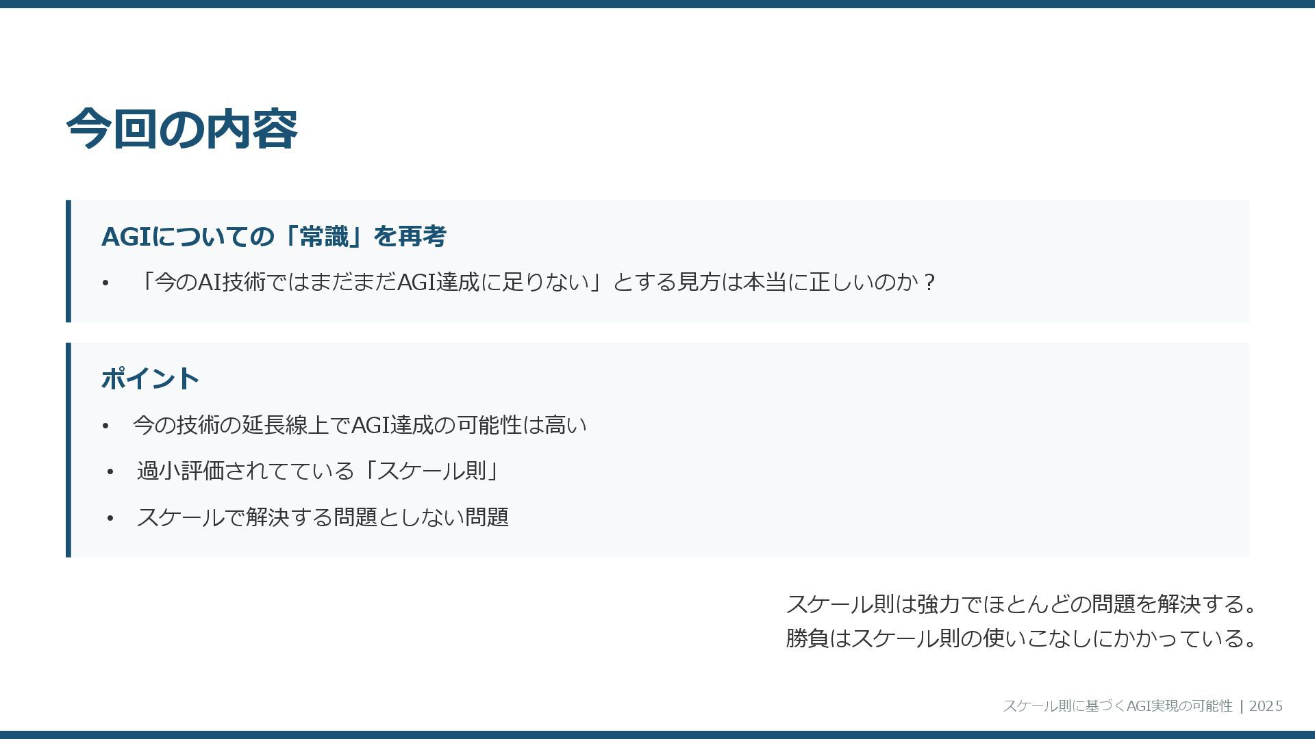 現状のAI技術の延長線上(最新のスケール則の延長線上)でAGIが実現可能である理由を、できるだけ分かりやすく&できるだけかみ砕かず説明することを試みた動画です。これに関連して、AI関連研究開発者がAIのスケールとどう付き合っていくべきかについてもお話しています。