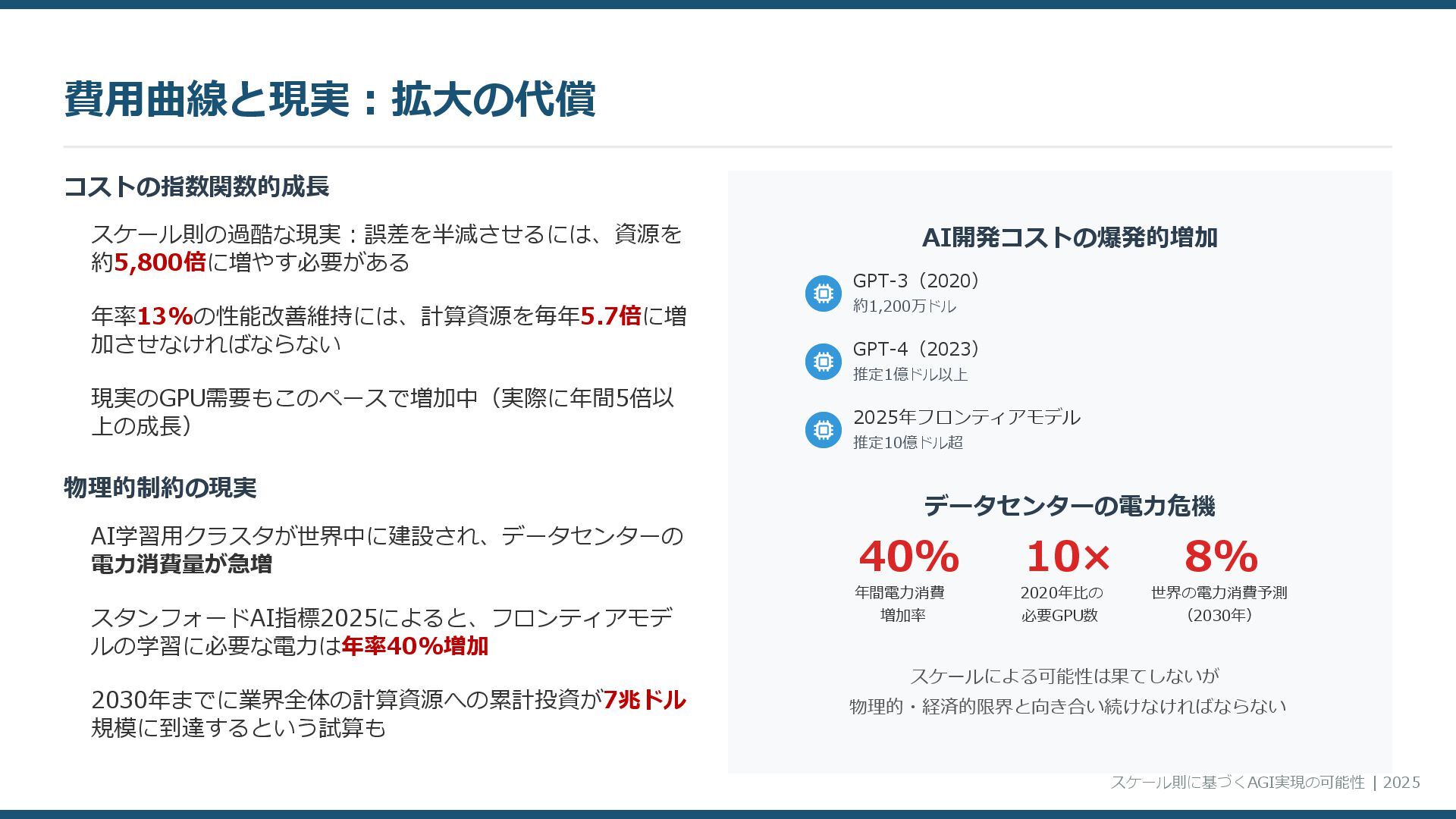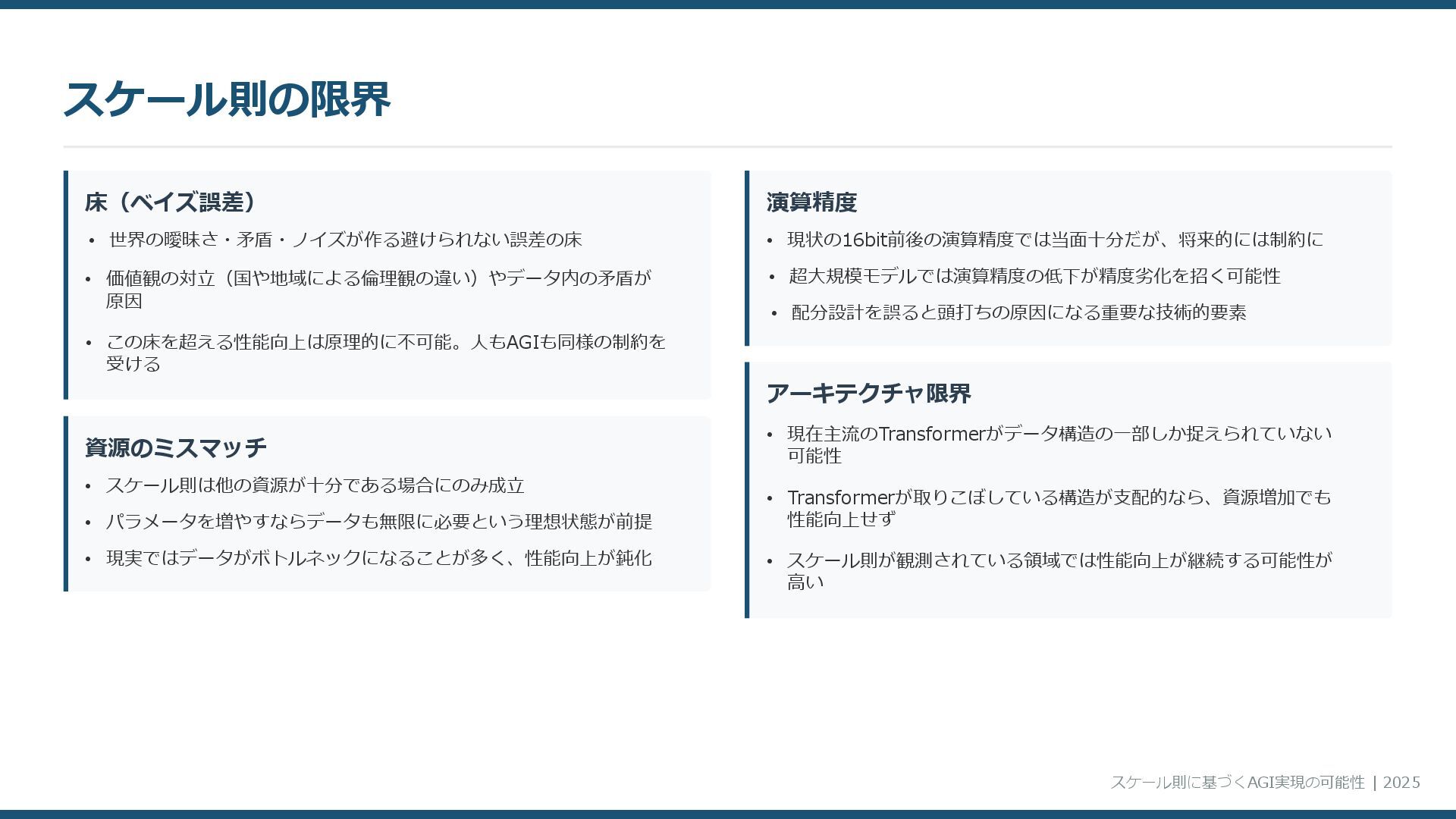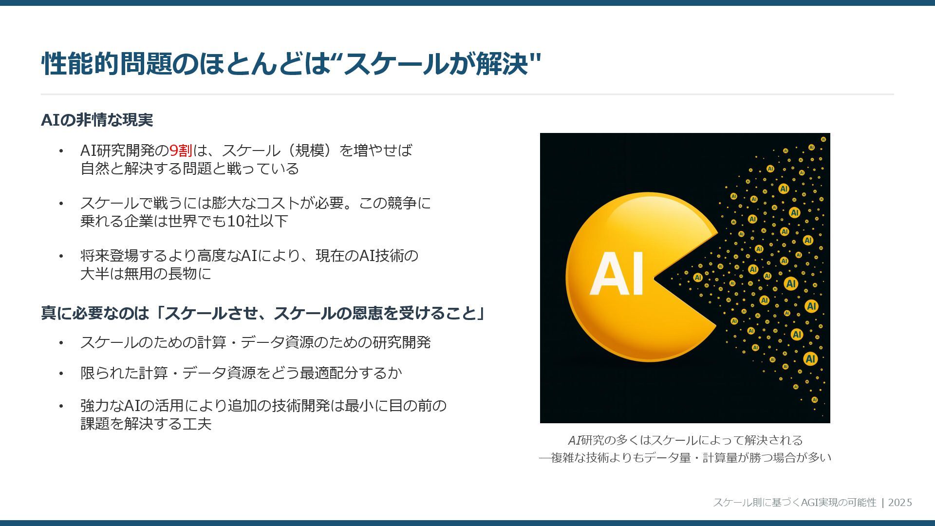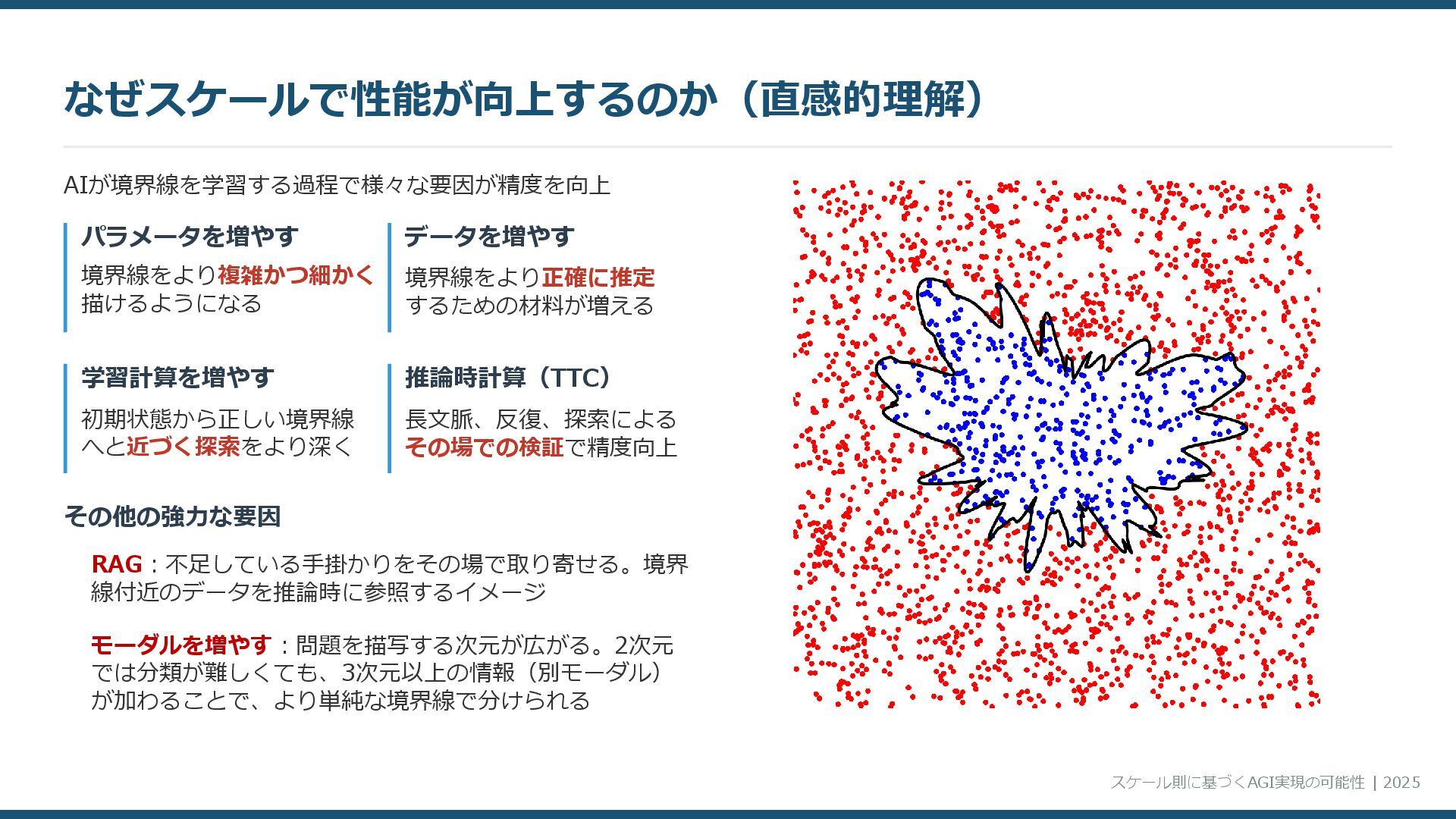 現状のAI技術の延長線上(最新のスケール則の延長線上)でAGIが実現可能である理由を、できるだけ分かりやすく&できるだけかみ砕かず説明することを試みた動画です。これに関連して、AI関連研究開発者がAIのスケールとどう付き合っていくべきかについてもお話しています。