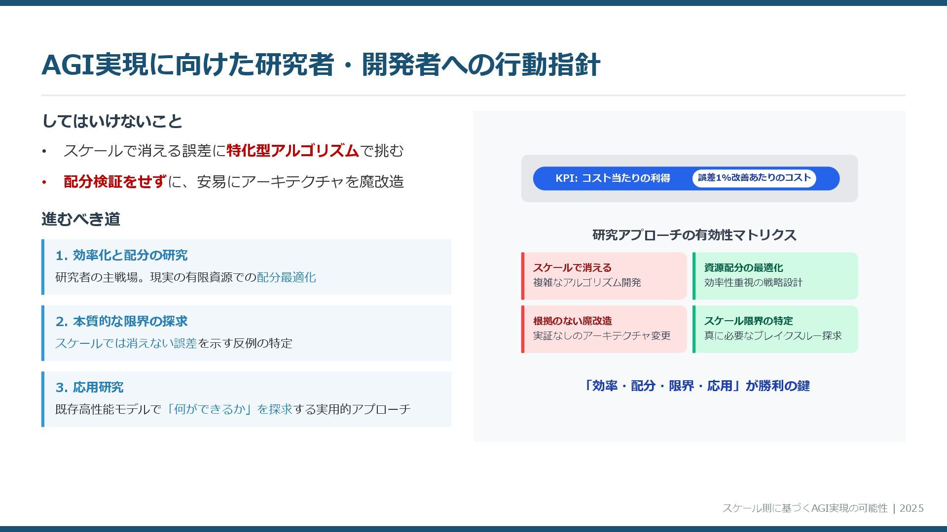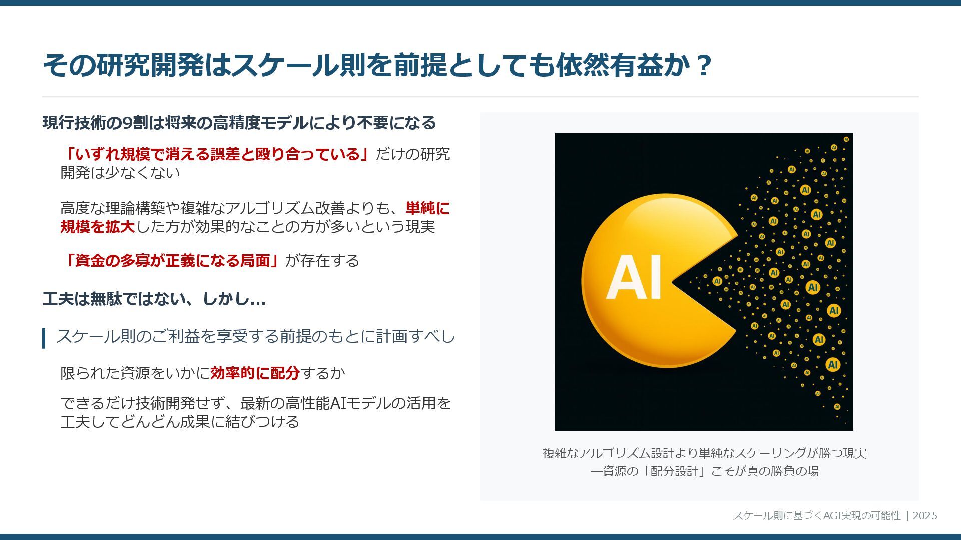 現在のAIのスケールした近い将来無駄になるような研究開発、応用開発ではなく、AGI時代につながるAIの発展に貢献する研究開発、AGI登場後も取り組みが生きる応用開発に集中する方が増えることに期待しています!