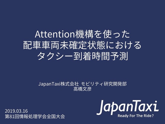 Attention機構を使った 配⾞⾞両未確定状態における タクシー到着時間予測 JapanTaxi株式会社 モビリティ研究開発部 ⾼橋⽂彦 2019.03.16 第81回情報処理学会全国⼤会