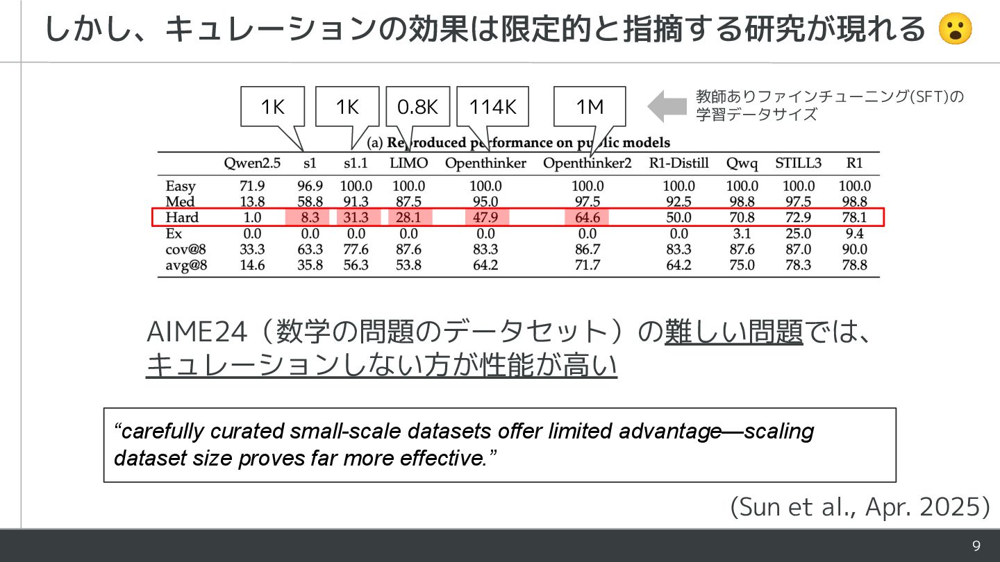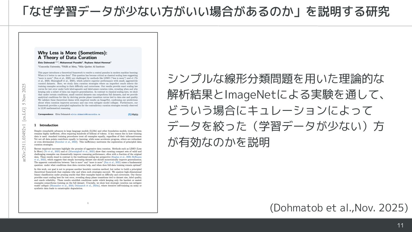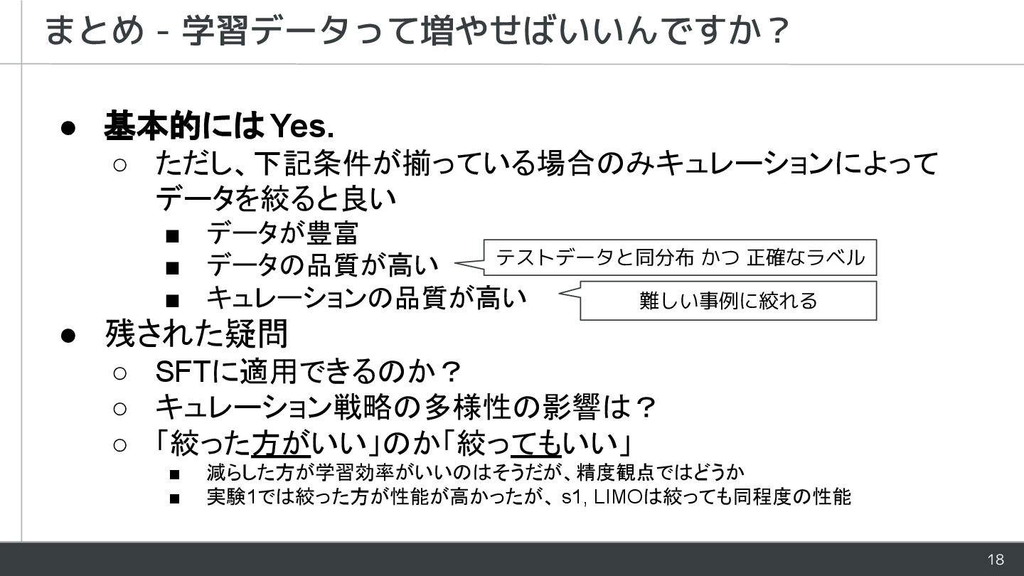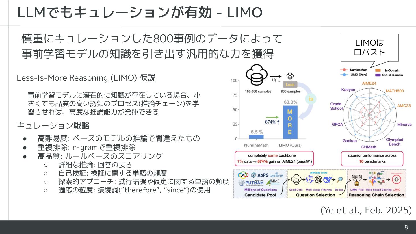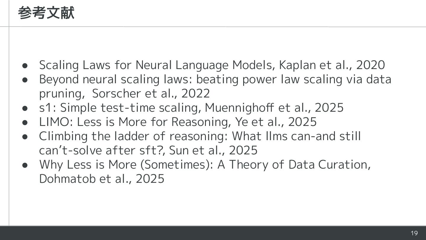 al., 2020 • Beyond neural scaling laws: beating power law scaling via data pruning, Sorscher et al., 2022 • s1: Simple test-time scaling, Muennighoff et al., 2025 • LIMO: Less is More for Reasoning, Ye et al., 2025 • Climbing the ladder of reasoning: What llms can-and still can’t-solve after sft?, Sun et al., 2025 • Why Less is More (Sometimes): A Theory of Data Curation, Dohmatob et al., 2025 参考文献
