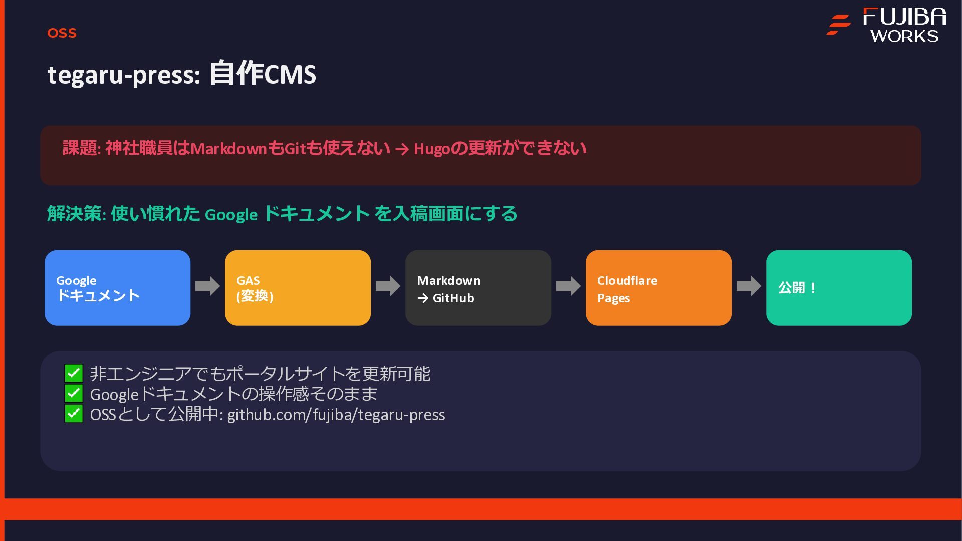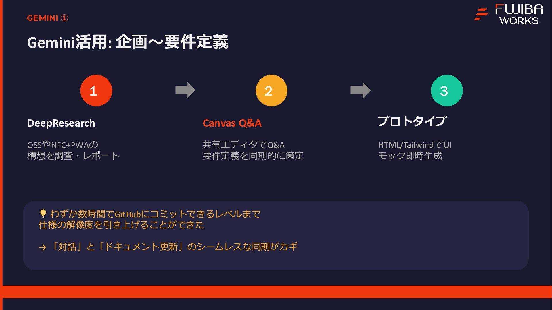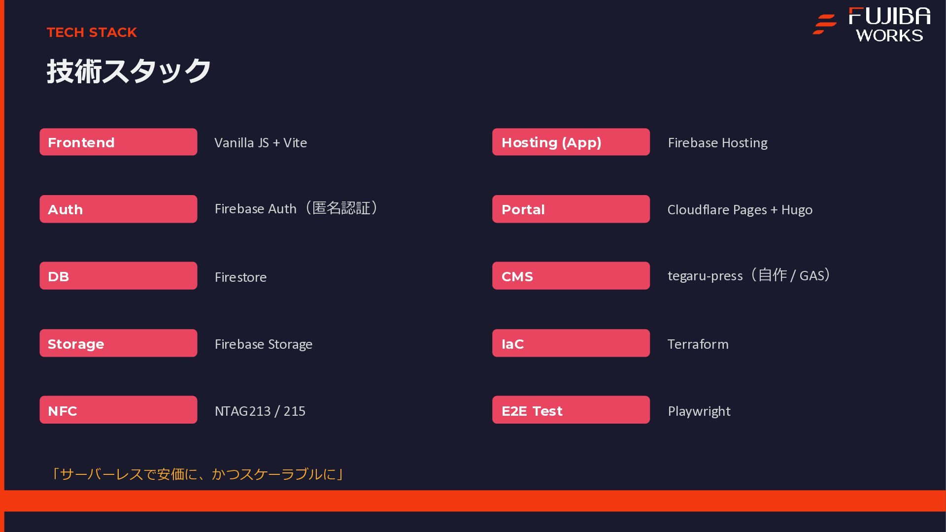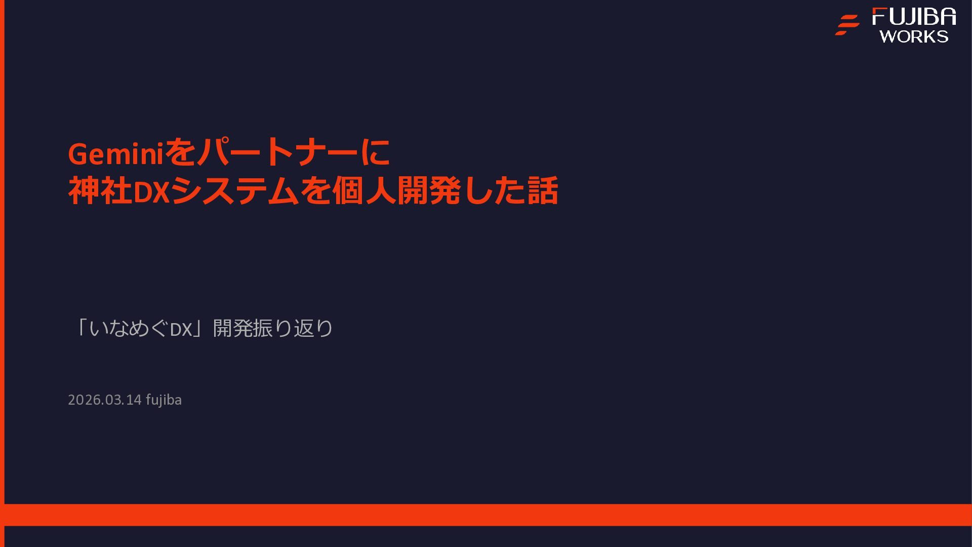 本プロジェクトは、エンジニア1名とAI(Gemini)の共作として進められ、企画から実装、実証実験までを一気通貫で行いました 。資料内では、Geminiを活用した高速の要件定義やプロトタイピングの手法に加え、サーバーレスな技術スタックについて解説しています 。また、3日間で1,907件のNFCタッチを記録し、50%を超える完走率を達成した実証実験の結果についてもデータを公開しています 。特に、個人開発において直面した「現場ならではのトラブル」とその解決策は、同様のシステムを検討されている方にとって有益な知見となるはずです 。主なトピック開発プロセス:DeepResearchやCanvas機能を用いた、AIとの協調による仕様策定 。技術スタック:Firebase、Vite、Terraformを活用したスケーラブルな構成 。現場の課題(Pitfalls):iOS/ブラウザの制約によるデータ永続化の難しさ 。金属面への設置によるNFC電波干渉問題 。Firebase匿名認証におけるデータの紐付けと運用の罠 。キャッシュ設定漏れによるインフラコストの変動 。OSS公開:GoogleドキュメントをCMS化し、非エンジニアでも更新可能にする自作ツール「tegaru-press」 。まとめ「AIは個人の実現力を底上げする」という実感とともに、技術で現場の課題を突破し、人間が本質的な体験設計に集中するためのマインドセットをまとめています 。