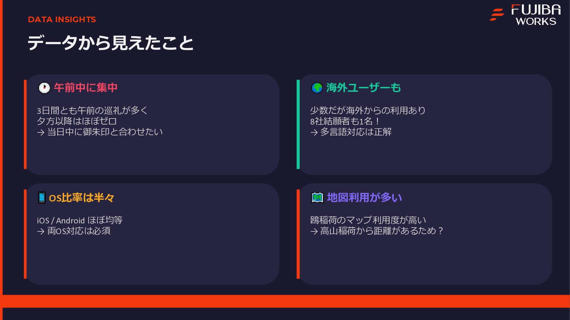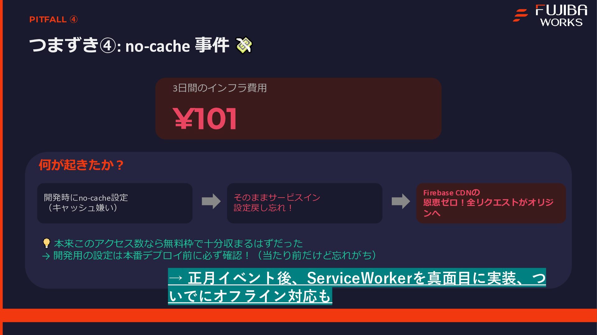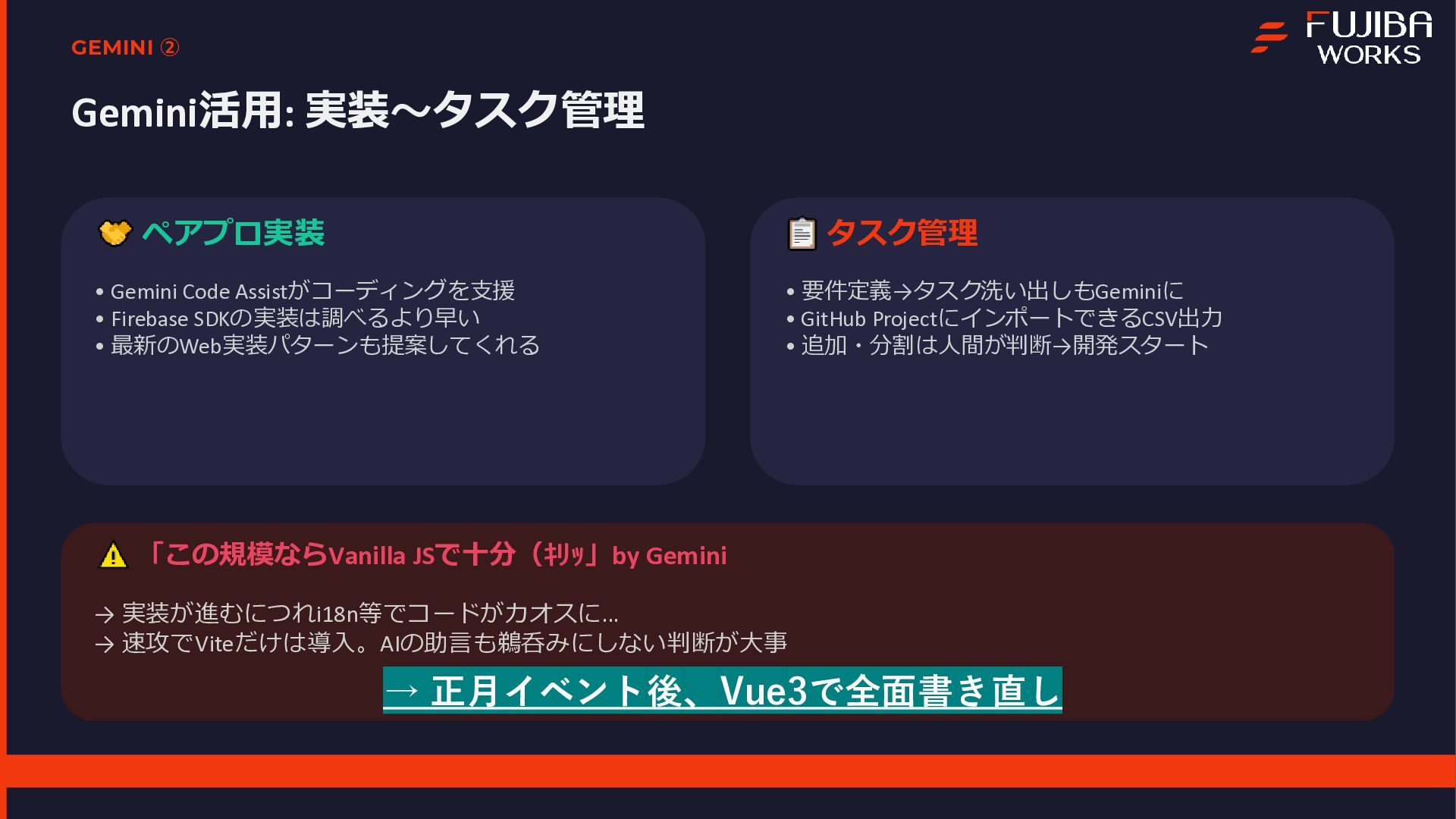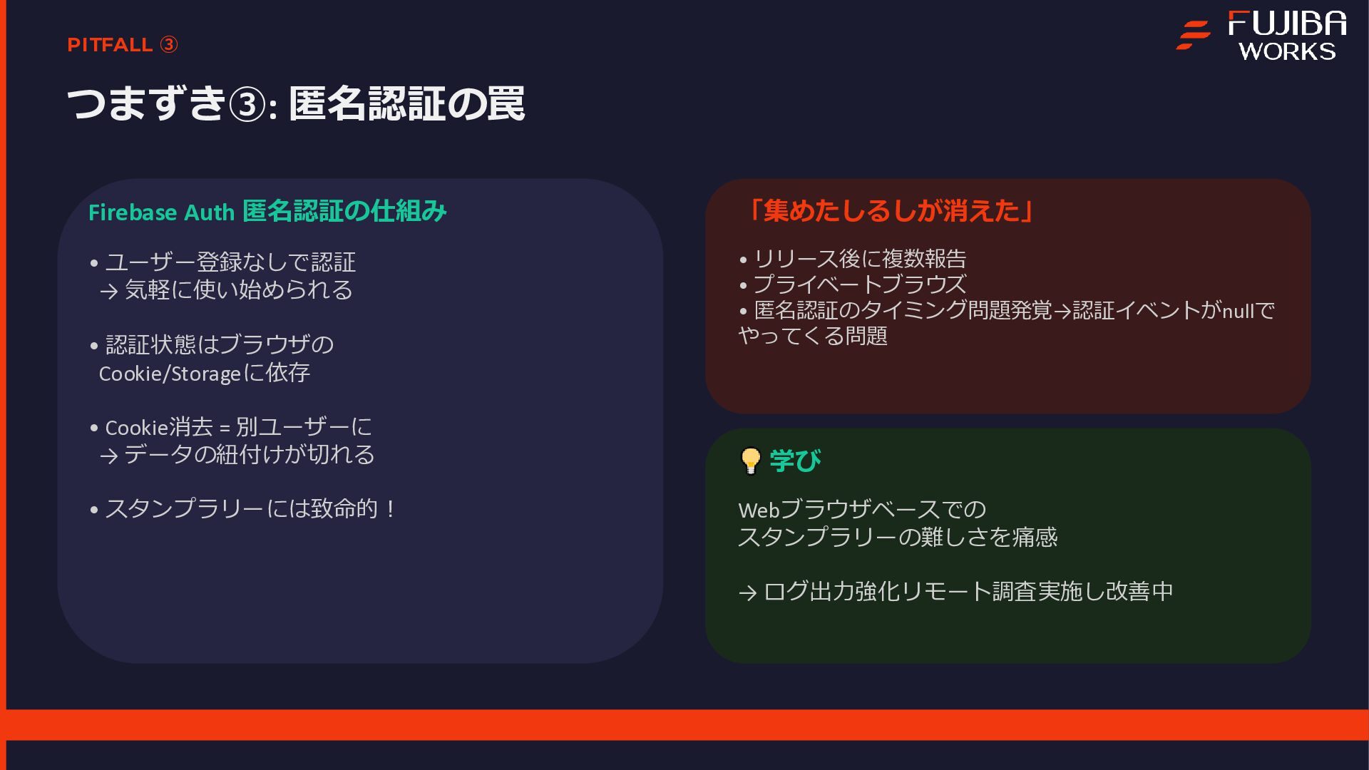 本プロジェクトは、エンジニア1名とAI(Gemini)の共作として進められ、企画から実装、実証実験までを一気通貫で行いました 。資料内では、Geminiを活用した高速の要件定義やプロトタイピングの手法に加え、サーバーレスな技術スタックについて解説しています 。また、3日間で1,907件のNFCタッチを記録し、50%を超える完走率を達成した実証実験の結果についてもデータを公開しています 。特に、個人開発において直面した「現場ならではのトラブル」とその解決策は、同様のシステムを検討されている方にとって有益な知見となるはずです 。主なトピック開発プロセス:DeepResearchやCanvas機能を用いた、AIとの協調による仕様策定 。技術スタック:Firebase、Vite、Terraformを活用したスケーラブルな構成 。現場の課題(Pitfalls):iOS/ブラウザの制約によるデータ永続化の難しさ 。金属面への設置によるNFC電波干渉問題 。Firebase匿名認証におけるデータの紐付けと運用の罠 。キャッシュ設定漏れによるインフラコストの変動 。OSS公開:GoogleドキュメントをCMS化し、非エンジニアでも更新可能にする自作ツール「tegaru-press」 。まとめ「AIは個人の実現力を底上げする」という実感とともに、技術で現場の課題を突破し、人間が本質的な体験設計に集中するためのマインドセットをまとめています 。