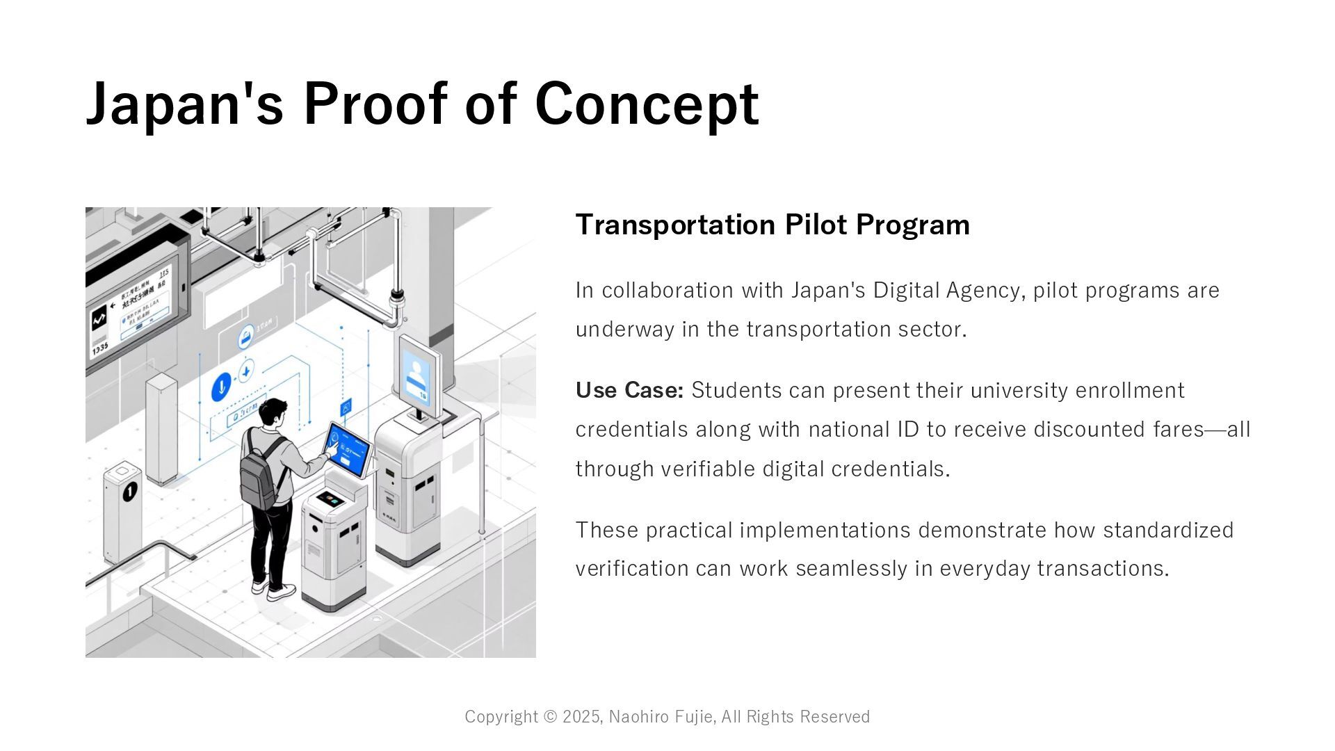 of Concept Transportation Pilot Program In collaboration with Japan's Digital Agency, pilot programs are underway in the transportation sector. Use Case: Students can present their university enrollment credentials along with national ID to receive discounted fares—all through verifiable digital credentials. These practical implementations demonstrate how standardized verification can work seamlessly in everyday transactions.