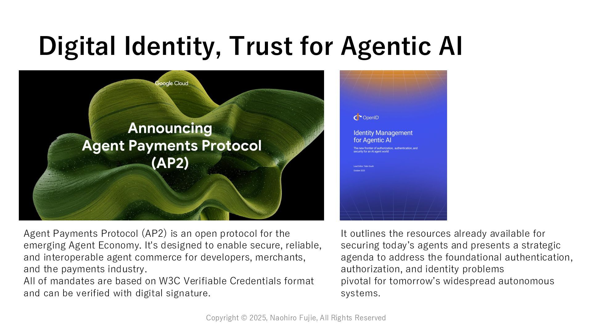 Trust for Agentic AI Agent Payments Protocol (AP2) is an open protocol for the emerging Agent Economy. It's designed to enable secure, reliable, and interoperable agent commerce for developers, merchants, and the payments industry. All of mandates are based on W3C Verifiable Credentials format and can be verified with digital signature. It outlines the resources already available for securing today’s agents and presents a strategic agenda to address the foundational authentication, authorization, and identity problems pivotal for tomorrow’s widespread autonomous systems.