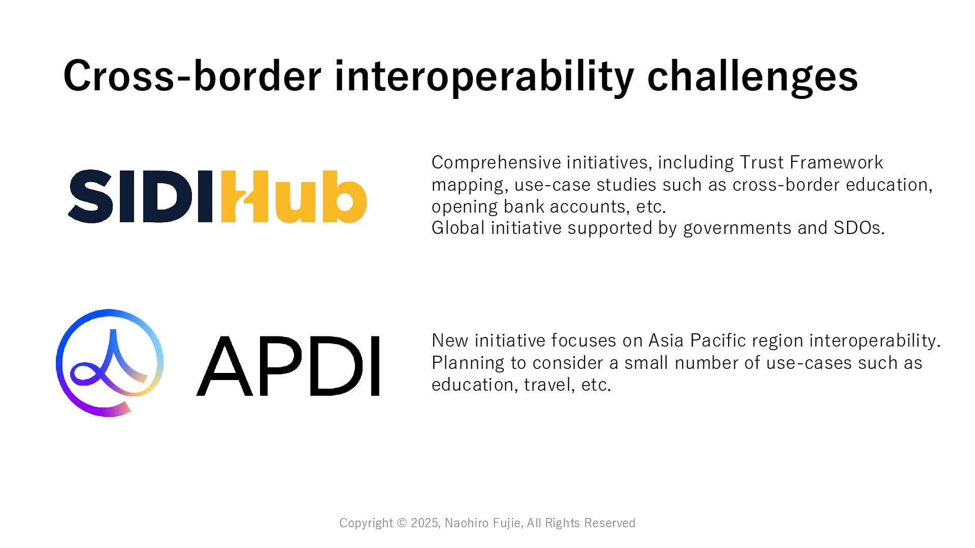 challenges Comprehensive initiatives, including Trust Framework mapping, use-case studies such as cross-border education, opening bank accounts, etc. Global initiative supported by governments and SDOs. New initiative focuses on Asia Pacific region interoperability. Planning to consider a small number of use-cases such as education, travel, etc.