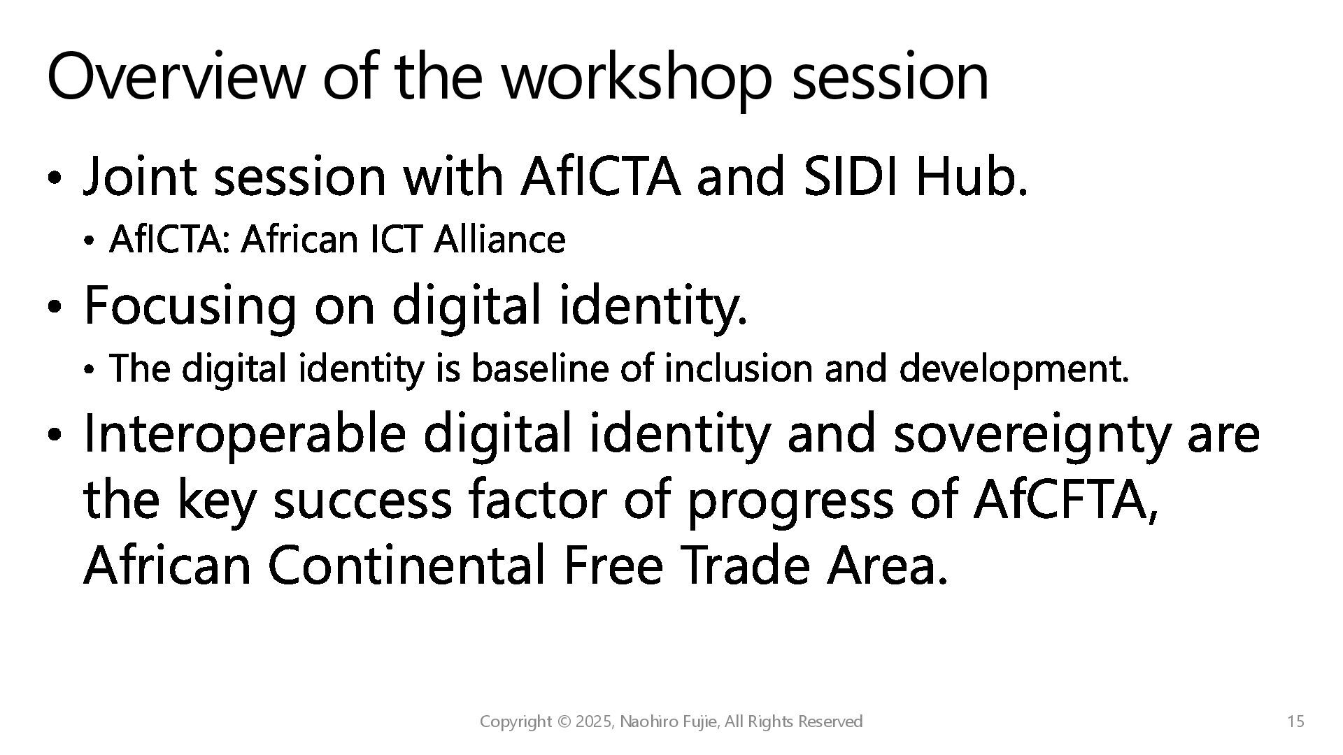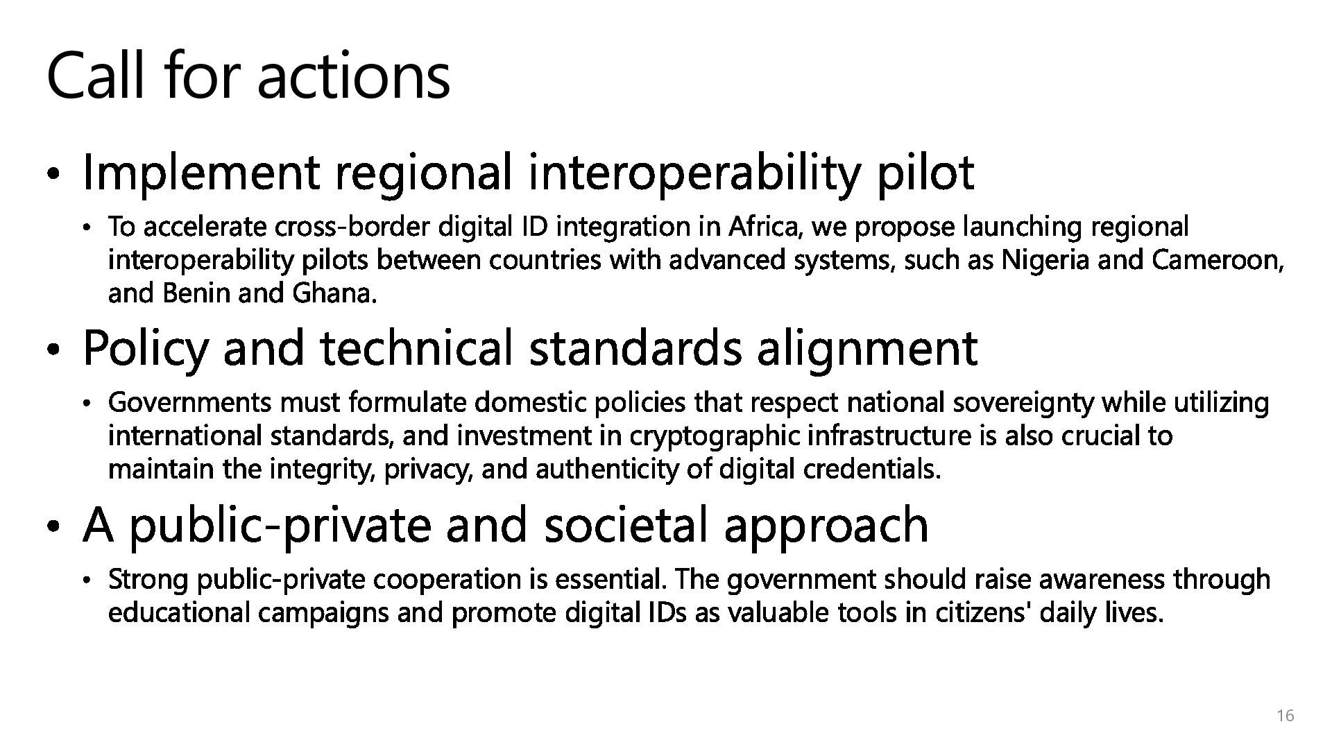 in Africa, we propose launching regional interoperability pilots between countries with advanced systems, such as Nigeria and Cameroon, and Benin and Ghana. Policy and technical standards alignment Governments must formulate domestic policies that respect national sovereignty while utilizing international standards, and investment in cryptographic infrastructure is also crucial to maintain the integrity, privacy, and authenticity of digital credentials. A public-private and societal approach Strong public-private cooperation is essential. The government should raise awareness through educational campaigns and promote digital IDs as valuable tools in citizens' daily lives. Call for actions 16