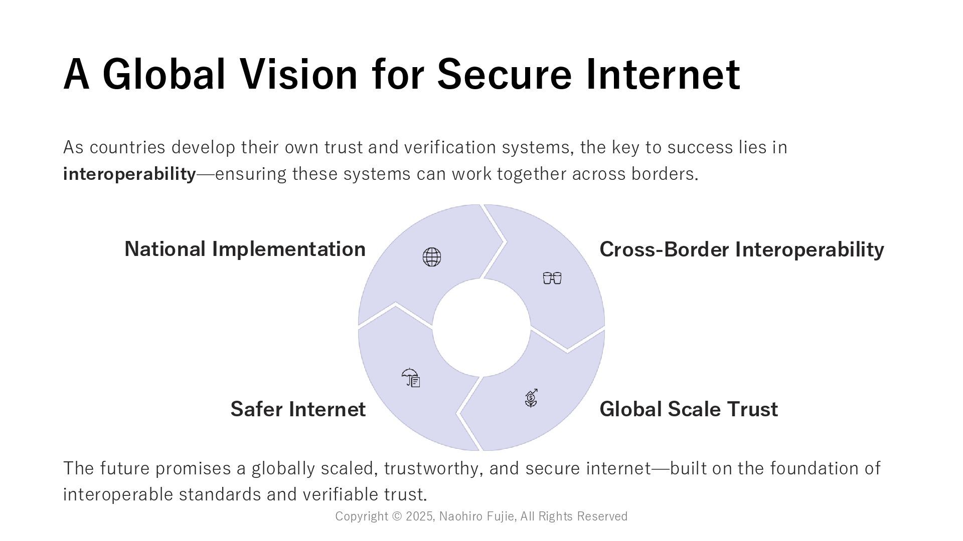 Vision for Secure Internet As countries develop their own trust and verification systems, the key to success lies in interoperability—ensuring these systems can work together across borders. National Implementation Cross-Border Interoperability Global Scale Trust Safer Internet The future promises a globally scaled, trustworthy, and secure internet—built on the foundation of interoperable standards and verifiable trust.